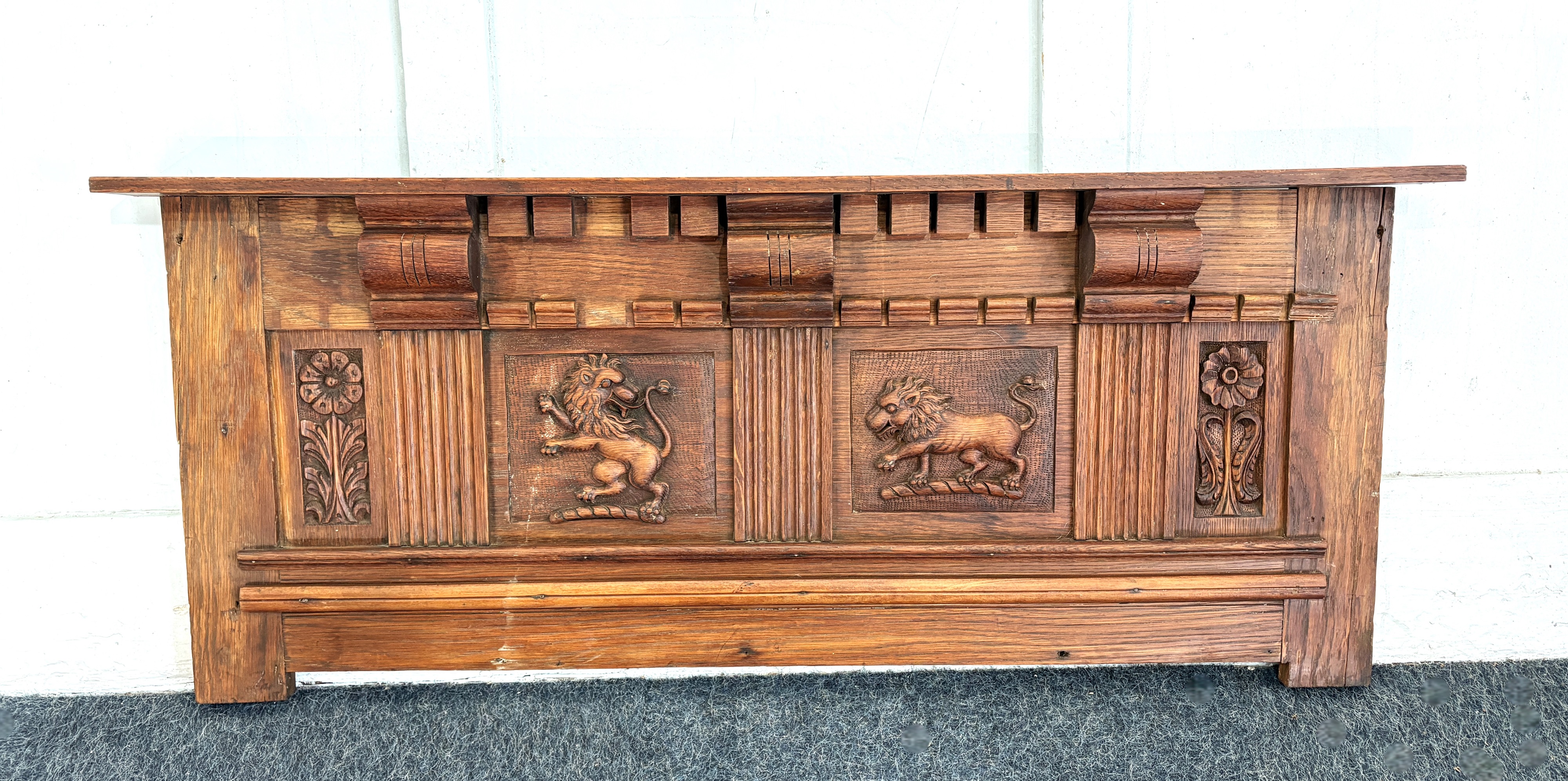 An Arts & crafts carved wooden panel, early 20th century, decorated with two central lions flanked by two stylised flowers, 104cm wide by 44cm high.