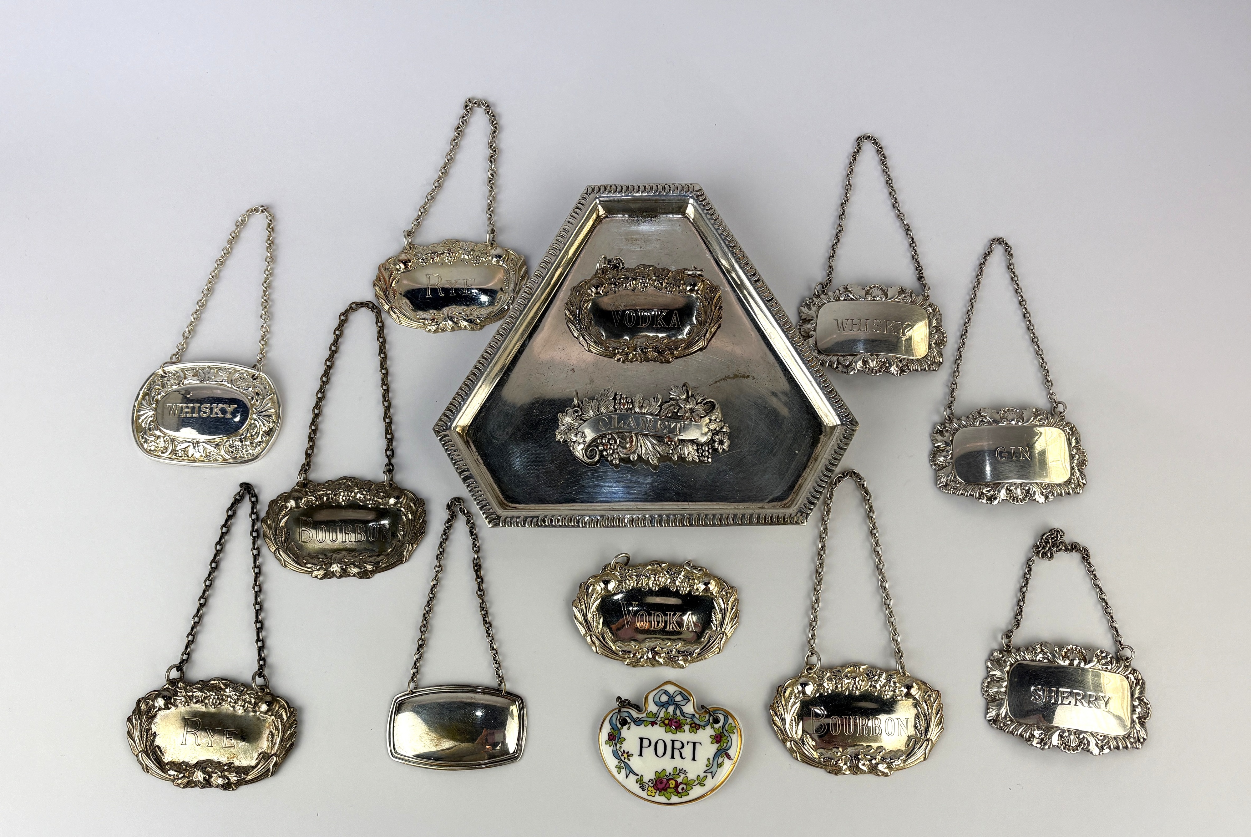 A collection of twelve silver plated decanter labels, one Coalport porcelain decanter label, and a silver plated bottle stand, (14).
