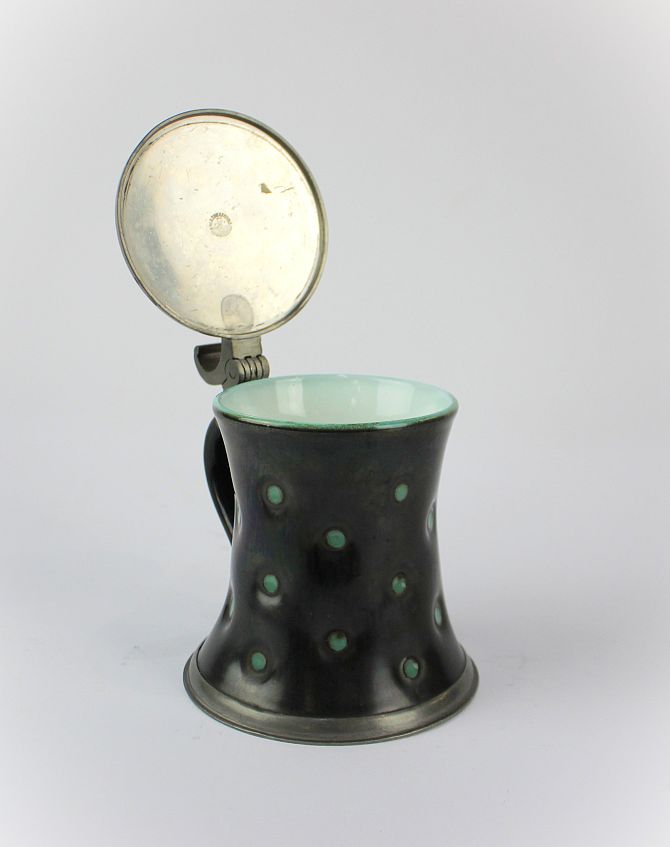 A vintage German lidded tankard, by R. W. Regensburg, decorated against the brown glaze with impressed dimples in turquoise glaze, with metal mount and lid, marked to underside of lid and impressed to base, height 15.75cm