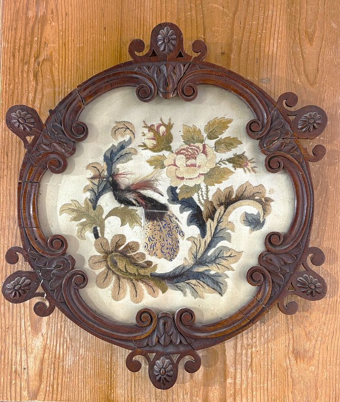 A Victorian feather and needlework panel depicting a bird amongst flowers and foliage in a decorated scroll carved glazed circular shaped frame, 42cm by 36cm (a/f)