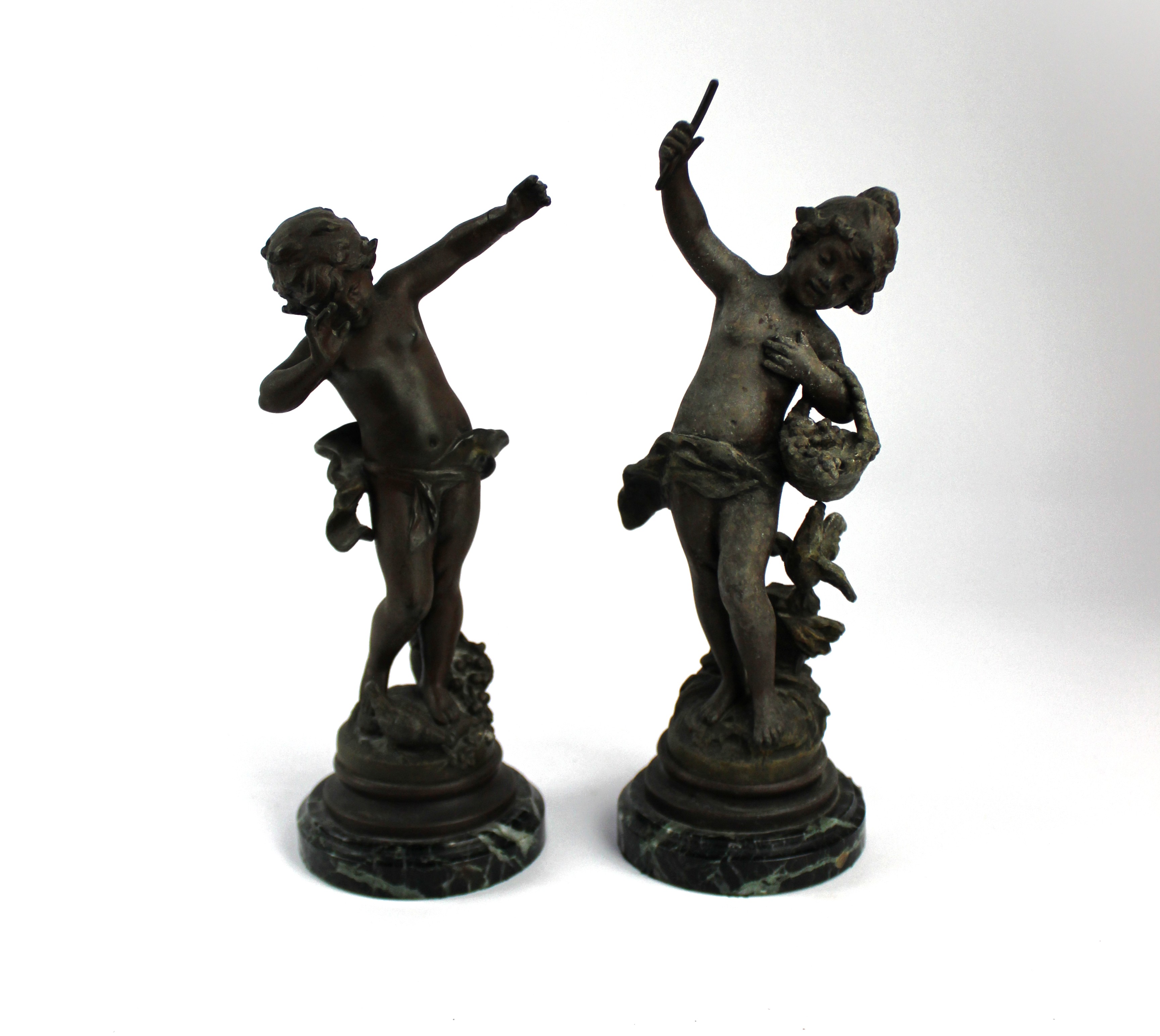 A pair of bronzed figures after Auguste Moreau (French, 1834 - 1917), c.1900/1910, depicting cherubs, raised on marble bases, 28cm high, (af).
