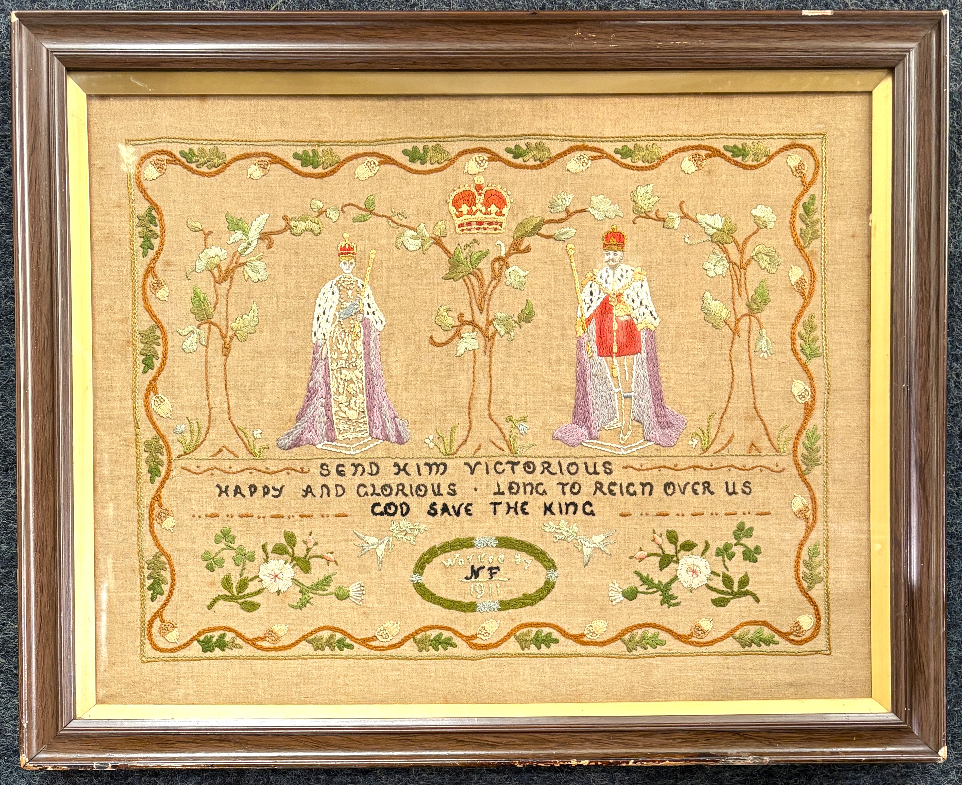 A framed needlework panel commemorating King George V and dated 1911, 42cm by 54cm