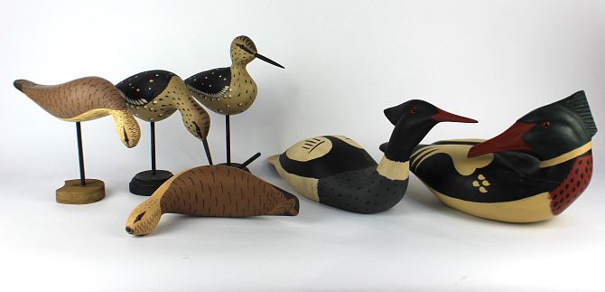 Six modern painted decorative decoy ducks to include a red-breasted merganser 34.5cm long, and a pair of snipe (a/f)