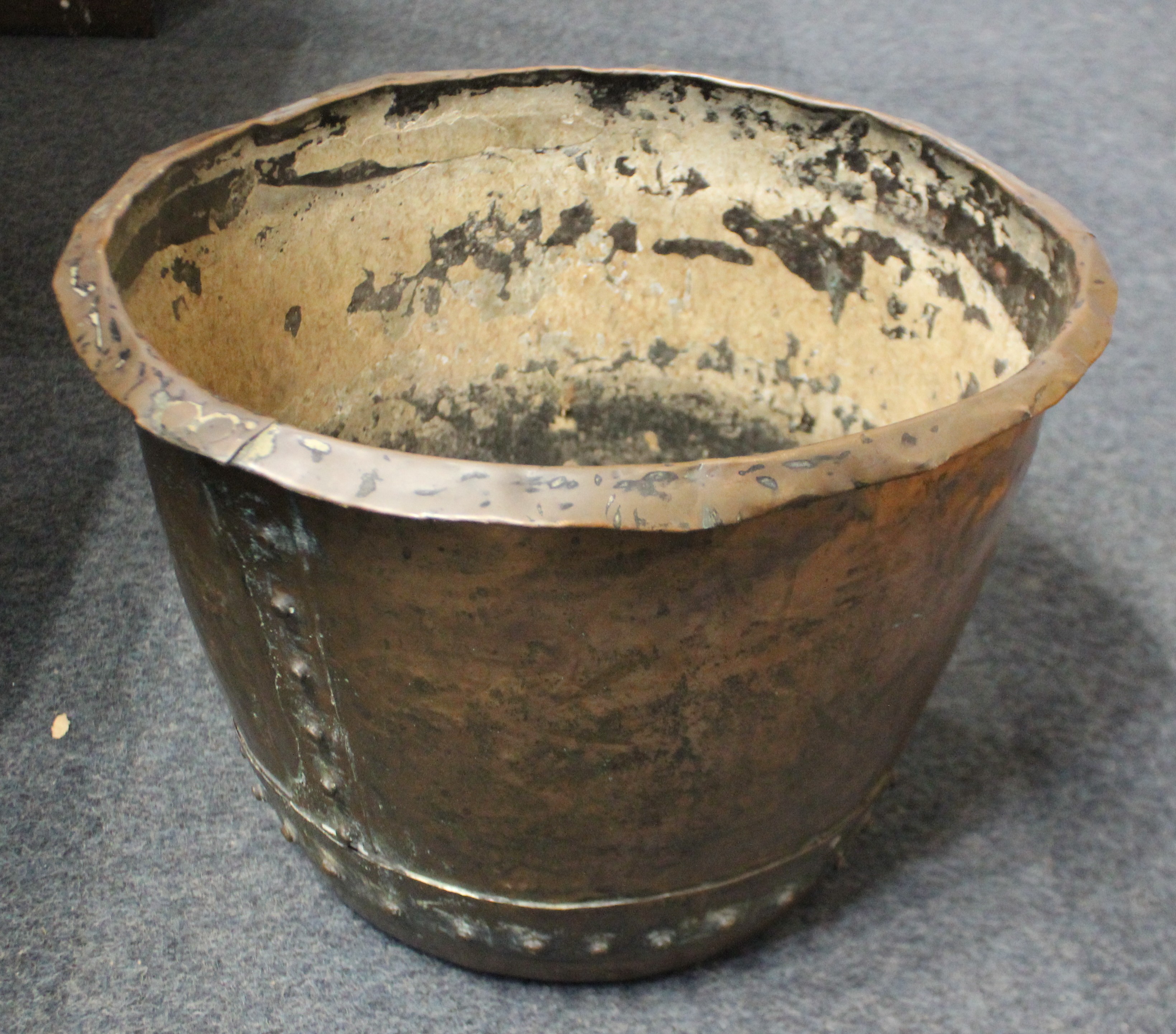 A copper copper, 19th century, riveted construction, 33cm high by 46cm diameter, (age related wear).