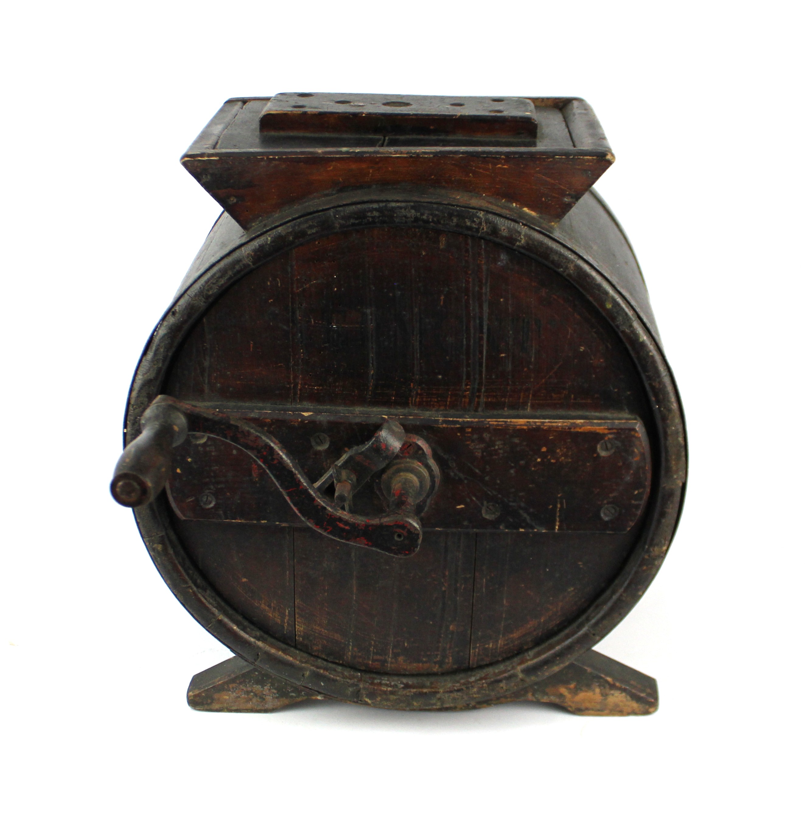 A late 19th/ early 20th century butter churn, metal bound, with turning handle and removable lid, height 45cm