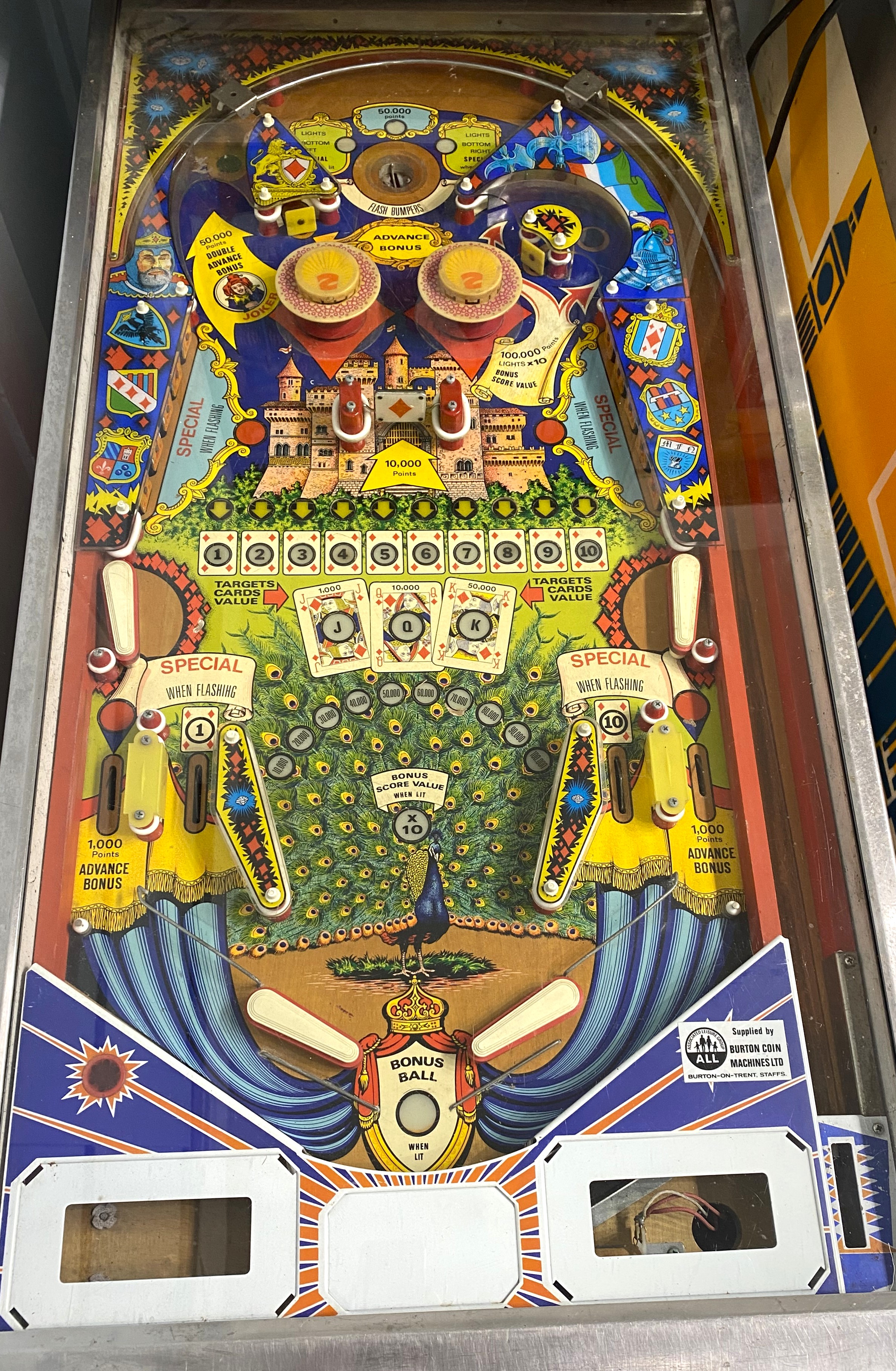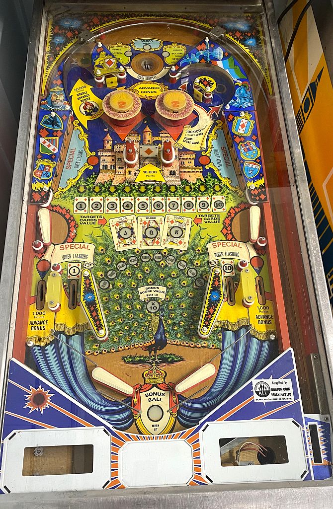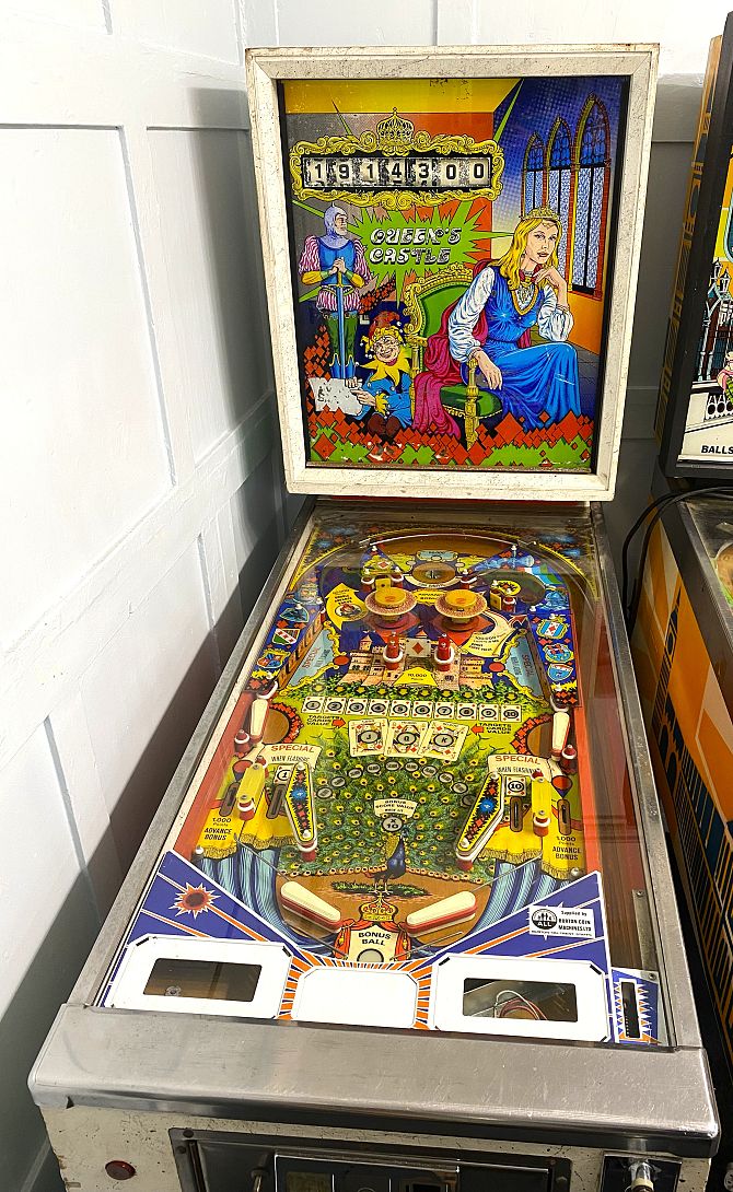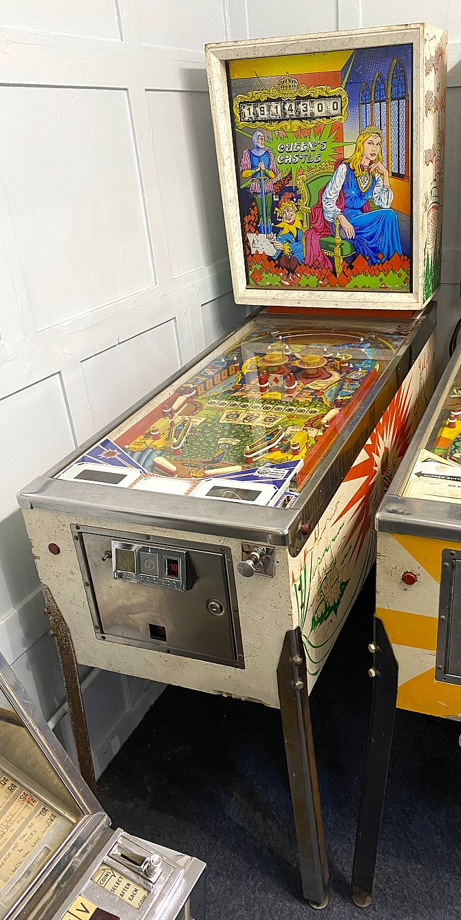 A vintage Zaccaria 'Queens Castle' pinball machine, c.1978, original bold striking designs throughout, chrome mounts, appears in good age related wear and patination, 137cm long by 59cm wide by 176cm high.