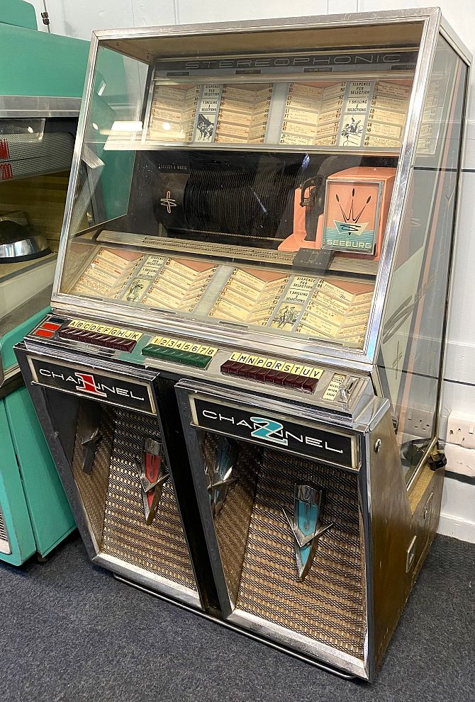 A c.1959 Seeburg Model 222SH jukebox, stereophonic, 160 selections of 45 RPM records, the stylish of the period cabinet with stylised recessed speakers, chrome mounts, side panel decoration, and glass panels, appears in good age related worn patination, 141cm high by 83cm wide by 69cm deep.