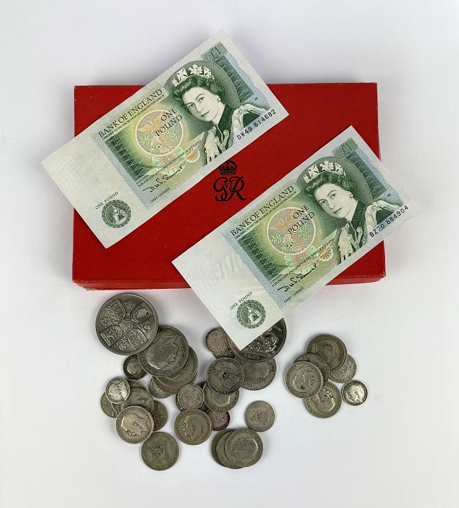 A quantity of British pre-decimal coins including pre 1920 and pre 1947 issue, a 1951 crown and two one pound notes, with a coin set box