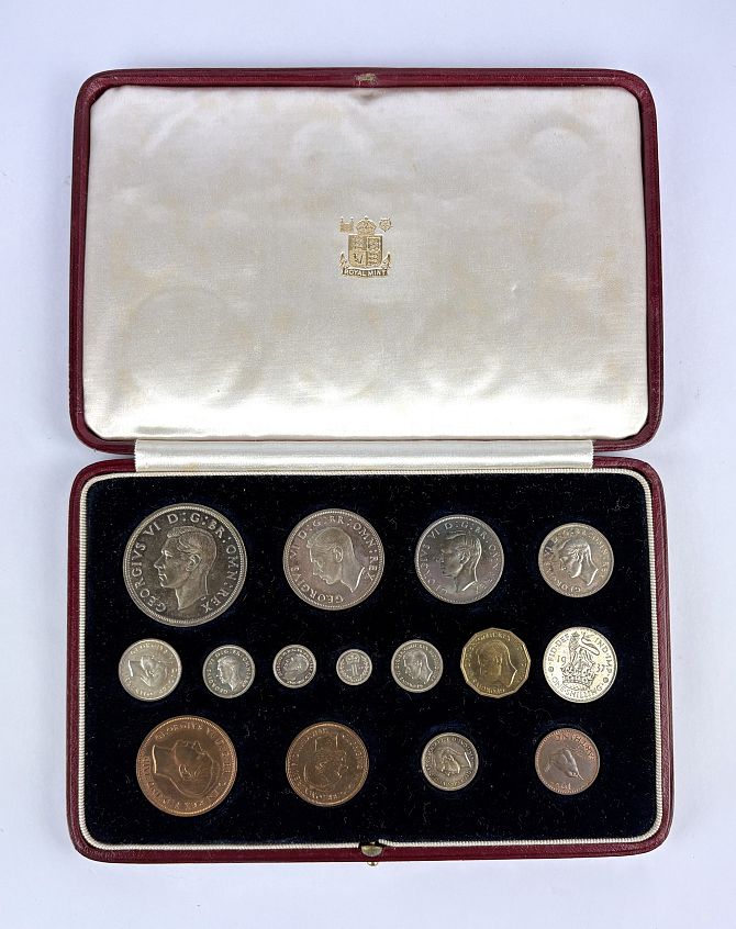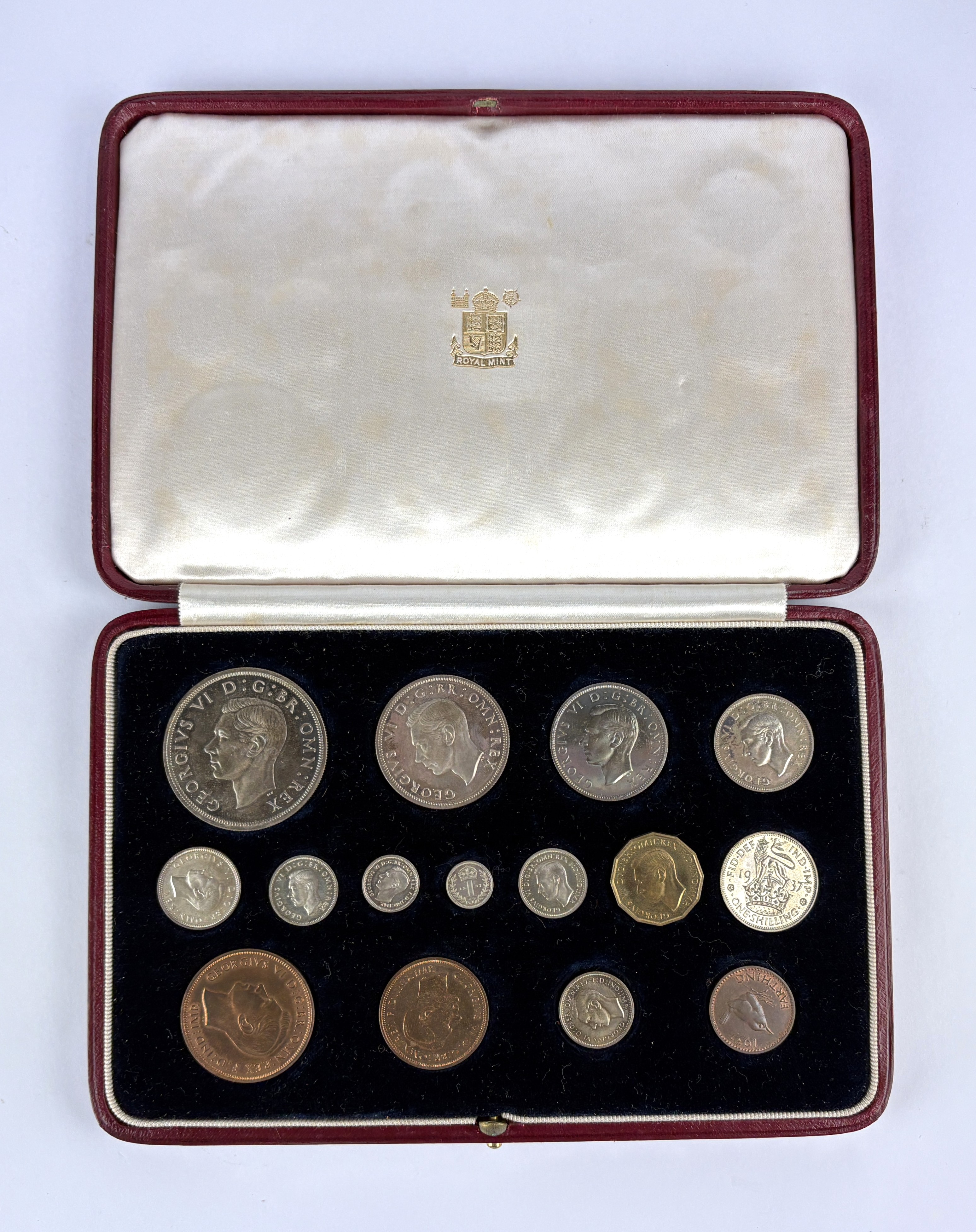A 1937 Coronation Year specimen coin set from crown to farthing including the four Maundy coins, with a case and box