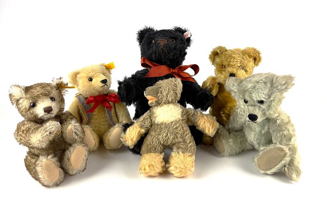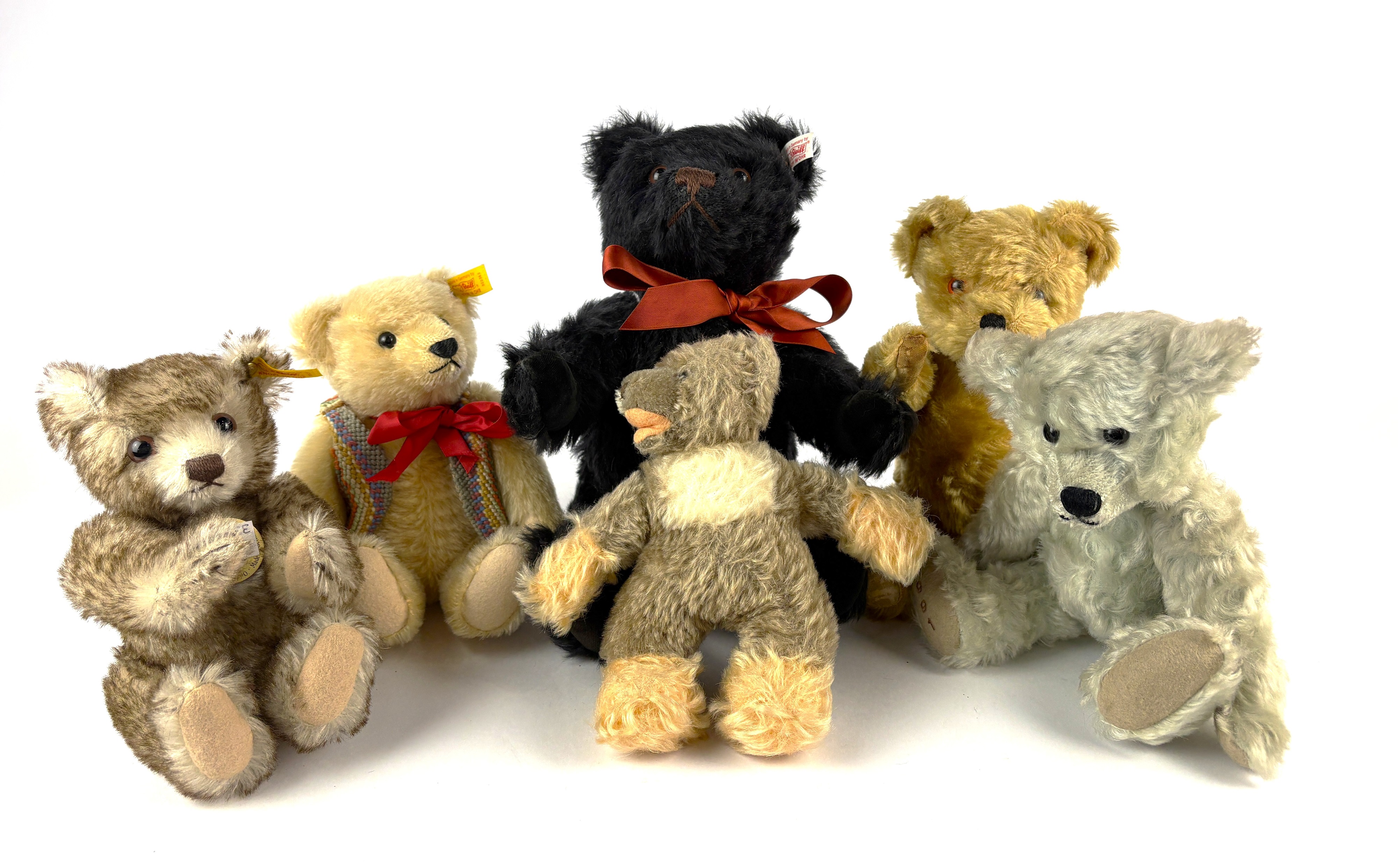 A Steiff limited edition teddy bear, 663208 Joshua Classic Black Bear, 1959-2009, white ear tag, 01660/5000, 34cm, a Steiff Classic 1926 Bear, yellow ear tag 006418, 23cm, a Steiff Classic 1909 Bear, yellow ear tag 000355, 24cm, a Twyford bear and two other stuffed bears