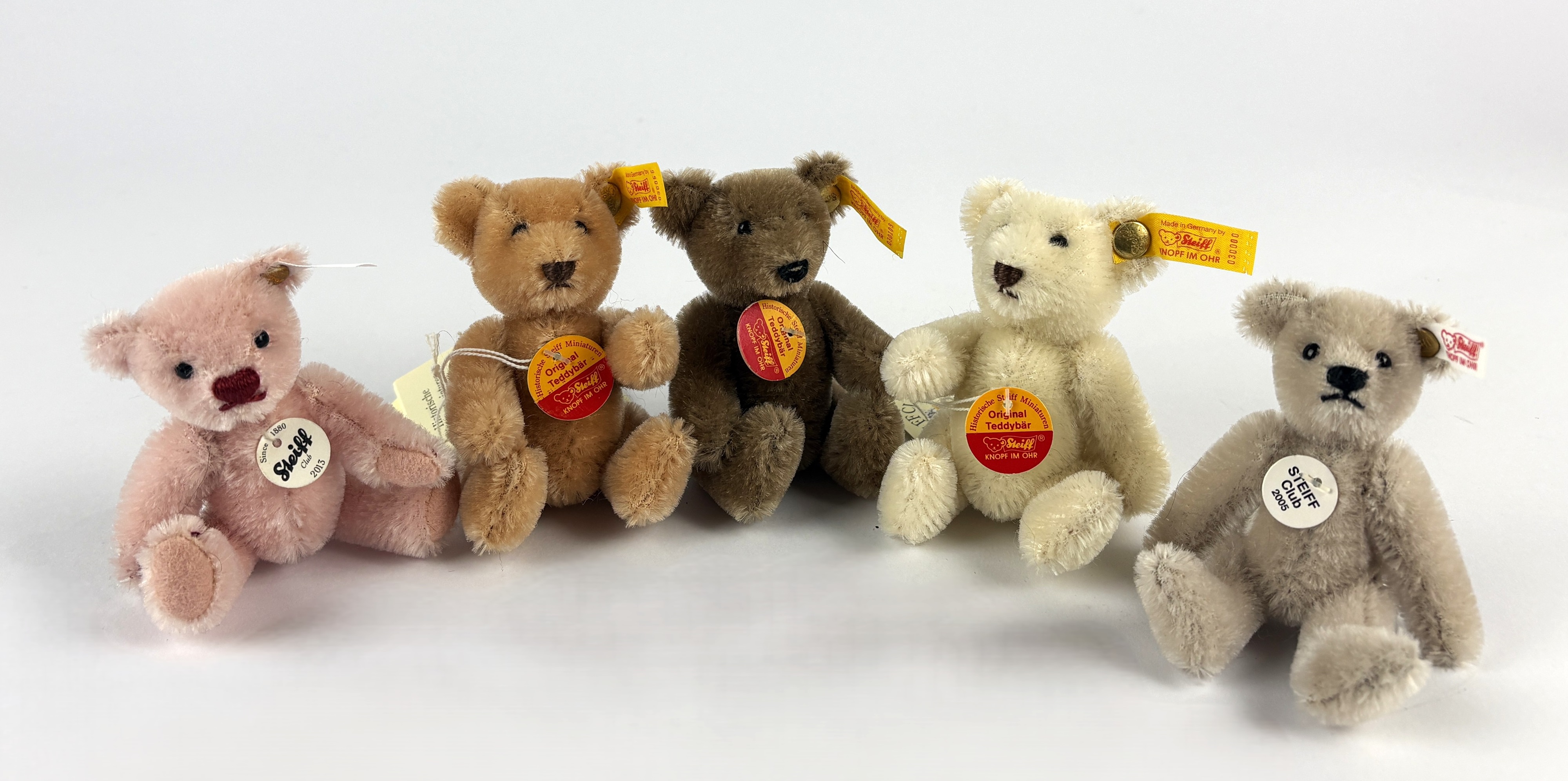 A collection of five boxed Steiff miniature teddy bears to include Steiff Teddy Bear silver grey 7cm Club Gift 2005, and Steiff Annual Club Gift 2013