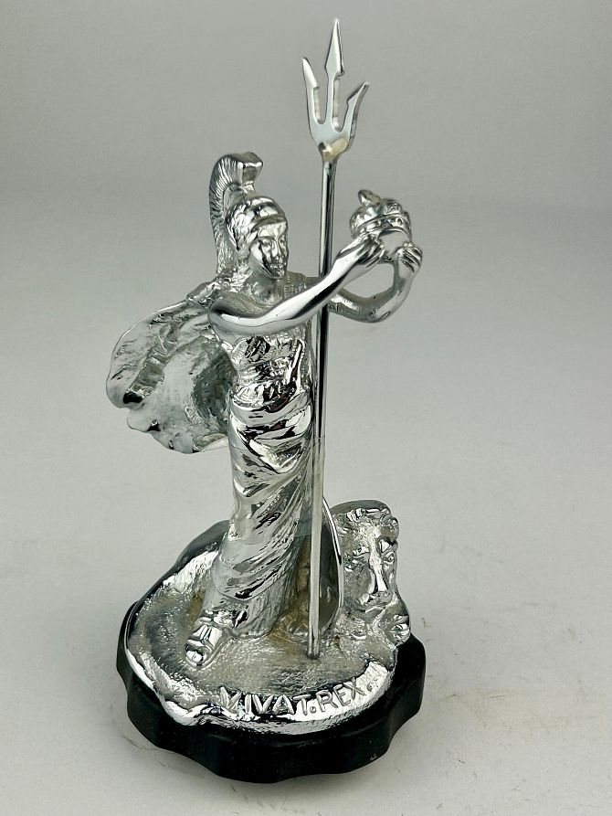 Car mascot / hood ornament: 'Britannia', silvered cast metal, impressed 'Vivat Rex' and 'REG 582850', on a radiator cap, total height 18cm.