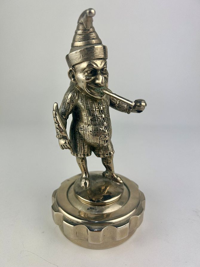 Car mascot / hood ornament: 'Mr Punch as Justice', chromed metal, raised on a radiator cap, total height 18cm.