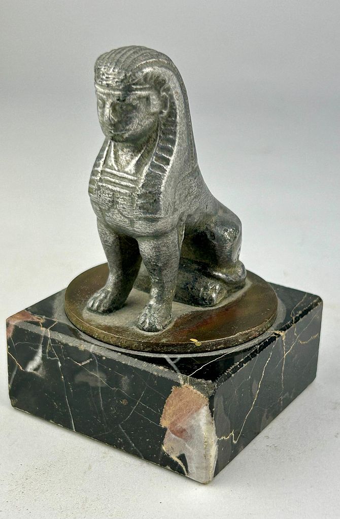 Car mascot / hood ornament: 'Sphinx' for Armstrong-Siddeley, cast alloy displayed on a later marble stand, combined height 11cm.
