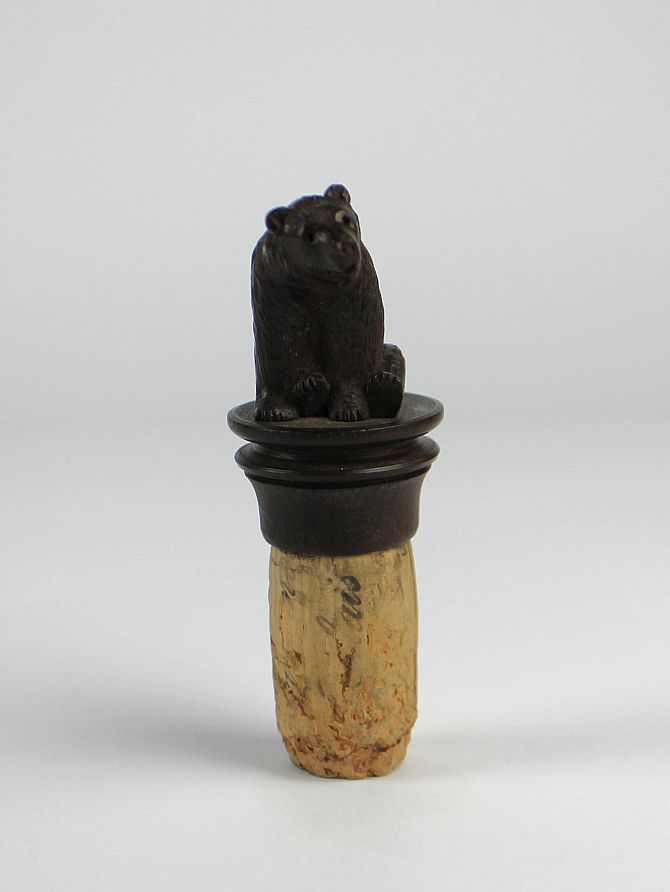 A vintage Black Forest carved novelty bottle stopper, in the form of a seated bear, with cork, height overall 9cm