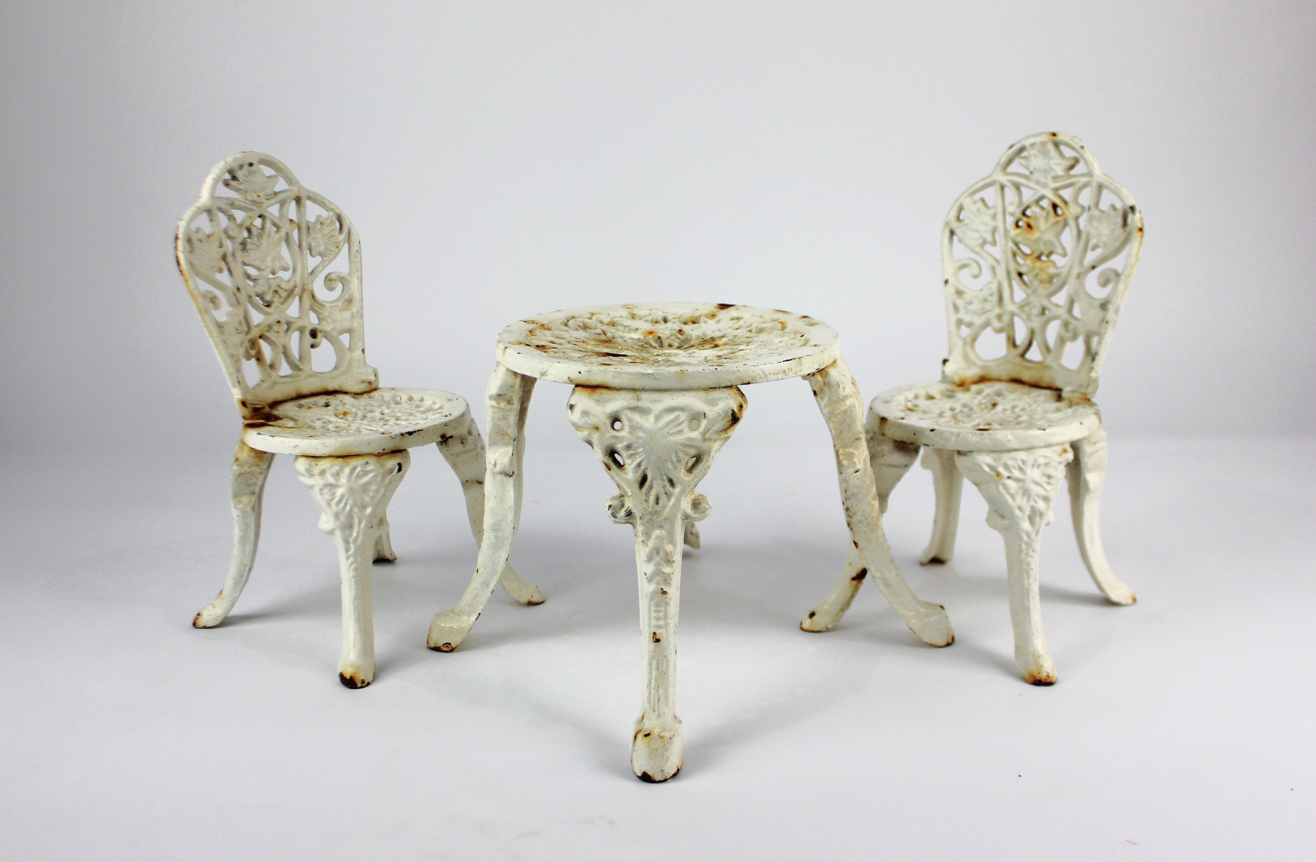 An unusual miniature set of cast iron garden furniture, comprising a pair of chairs and table, each white painted, with pierced decoration, chair height 23cm