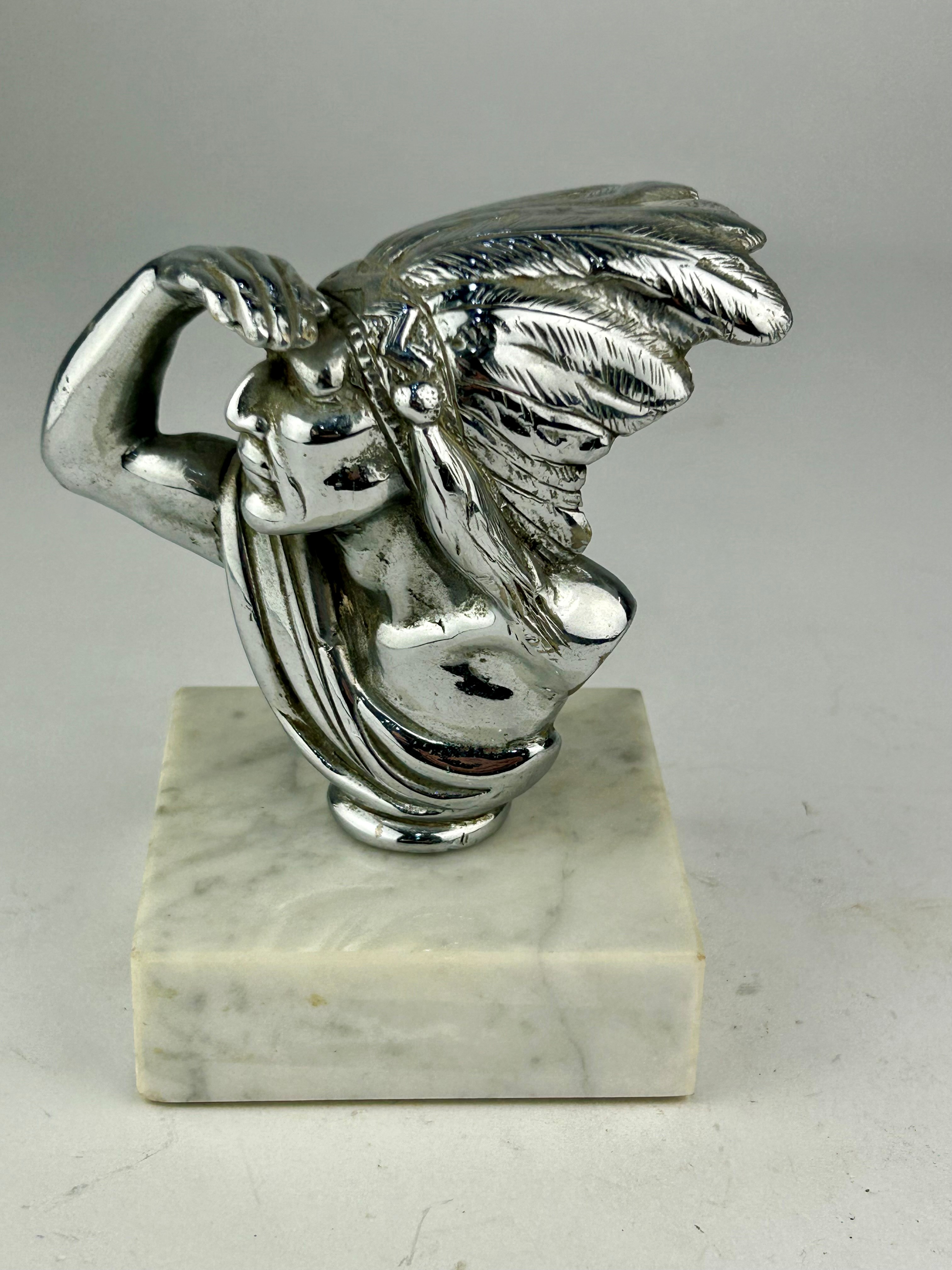 Car mascot / hood ornament: 'The Pathfinder', attributed to R Johns for Pontiac, silvered cast metral on a later marble base, total height 12cm.