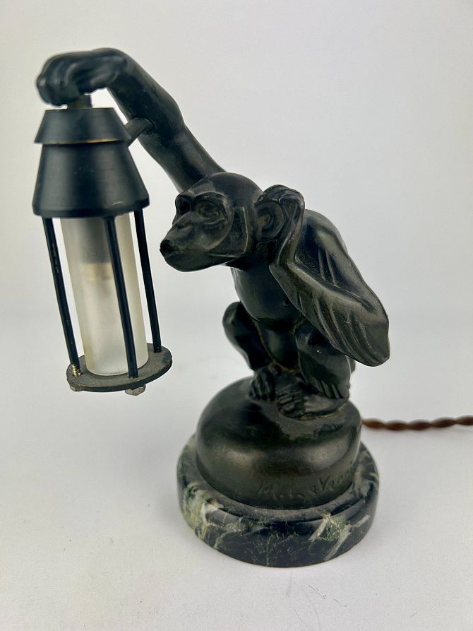 Car mascot / hood ornament: 'Boubou' depicting a monkey holding a lamp, by Max Le Verrier (Louis Octave Maxime Le Verrier), signed, the lamp with glass shade, cast metal and wired, raised on a marble plinth base, total height 16cm.