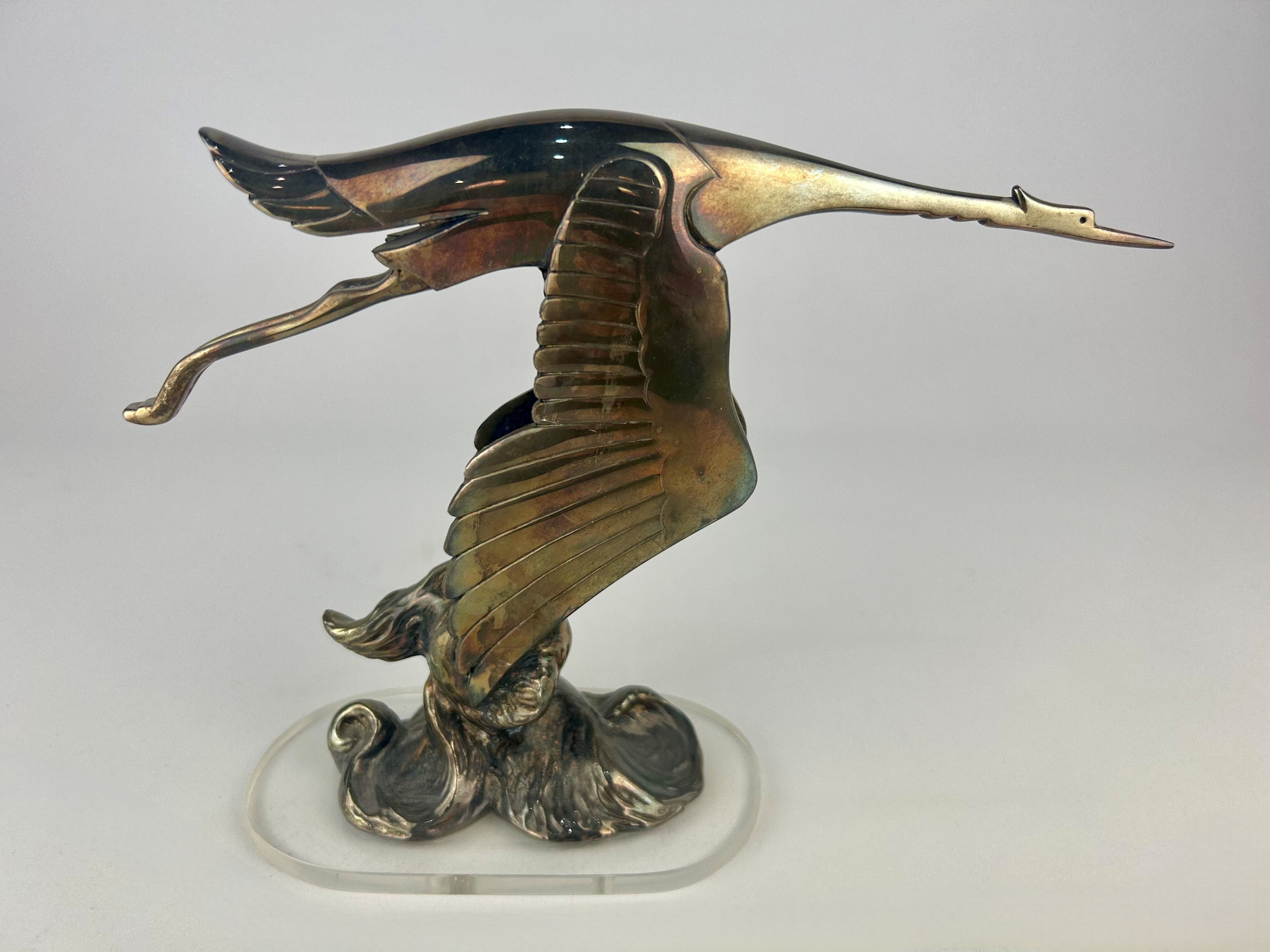 Car mascot / hood ornament: François Bazin, 'Flying Stork', for the Hispano-Suiza motor car, silvered metal, signed, on later clear base, total height 16.5cm.