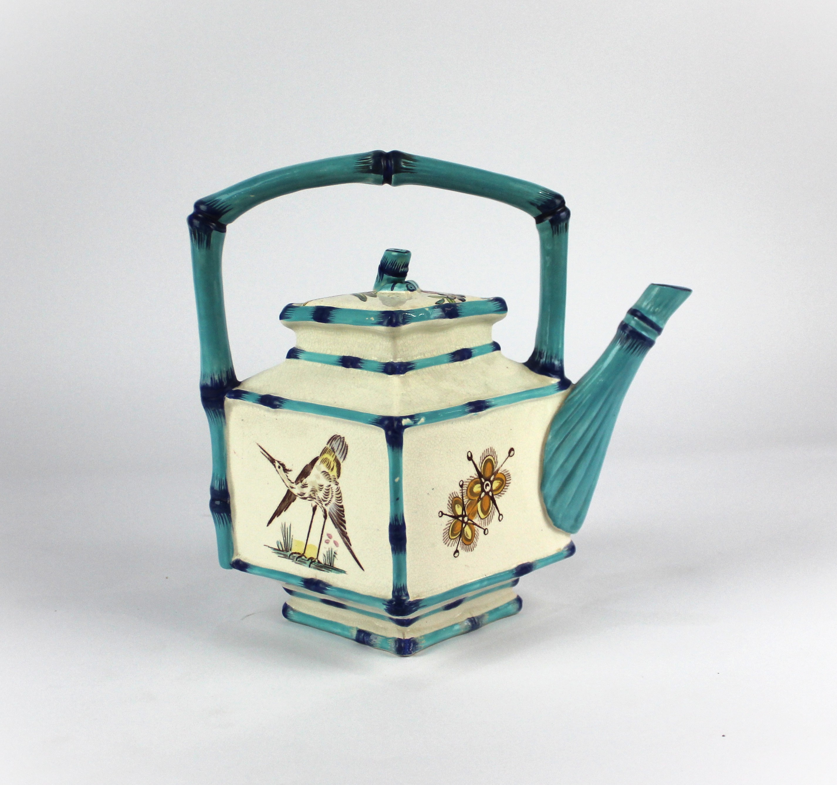 A late 19th century Aesthetic movement inspire teapot and cover, of square form with handle and spout modelled as bamboo, decorated with Japanese inspired panels, bearing inscribed number to base 1517, height 23cm