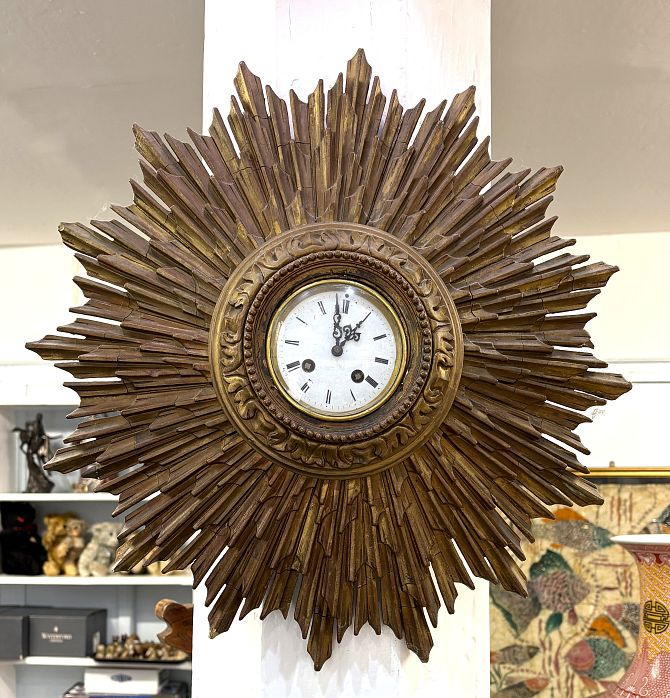 A vintage gilt starburst wall clock the circular white enamel dial with Roman numerals, 49cm wide
