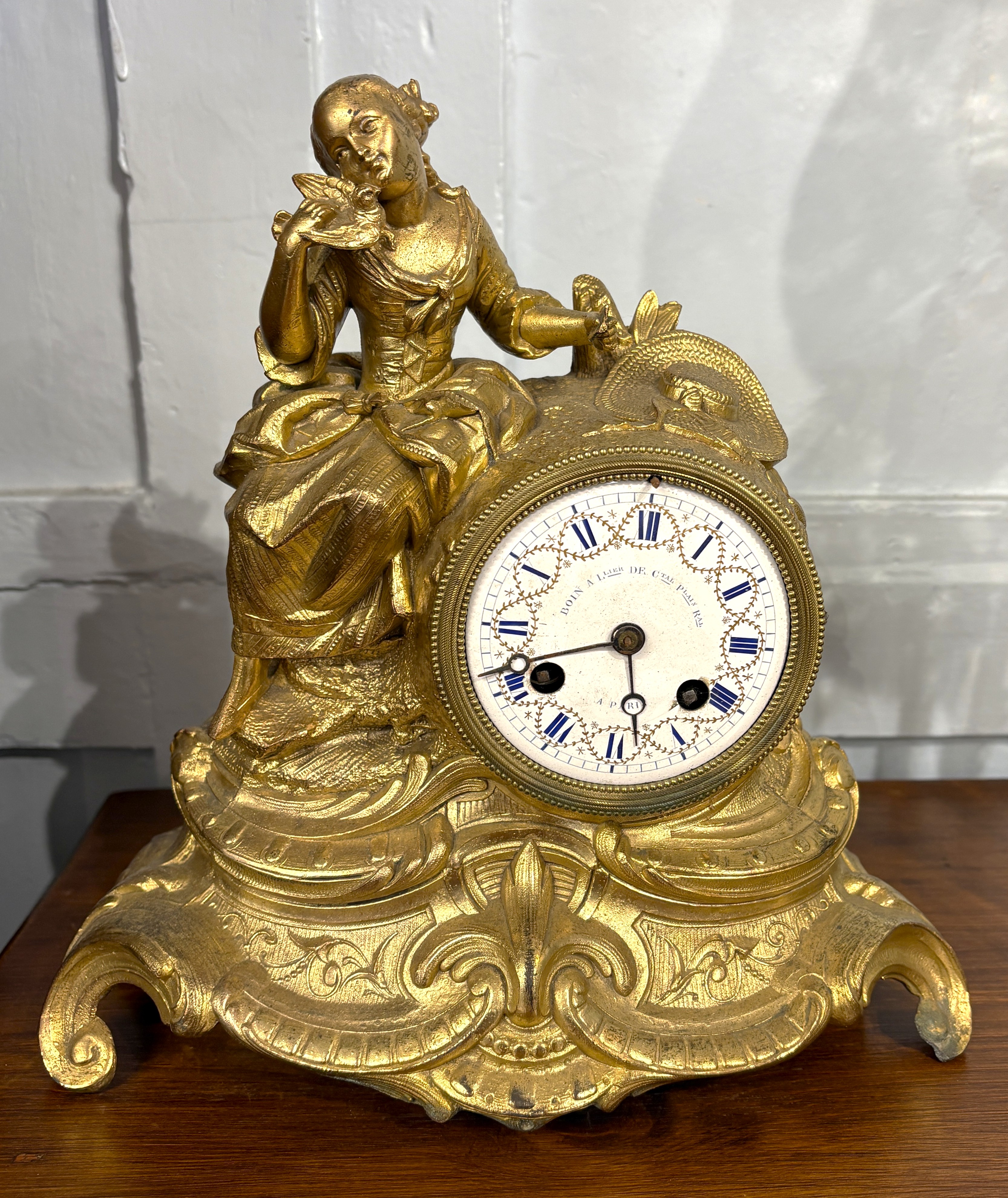 A 19th century French gilt metal figural mantle clock, the circular painted enamel dial bearing Roman numerals and inscribed 'BOIN A LLIER CTAL PLAIS RAL', flanked by a figure of a lady with dove, on a scrolling base, 27cm high