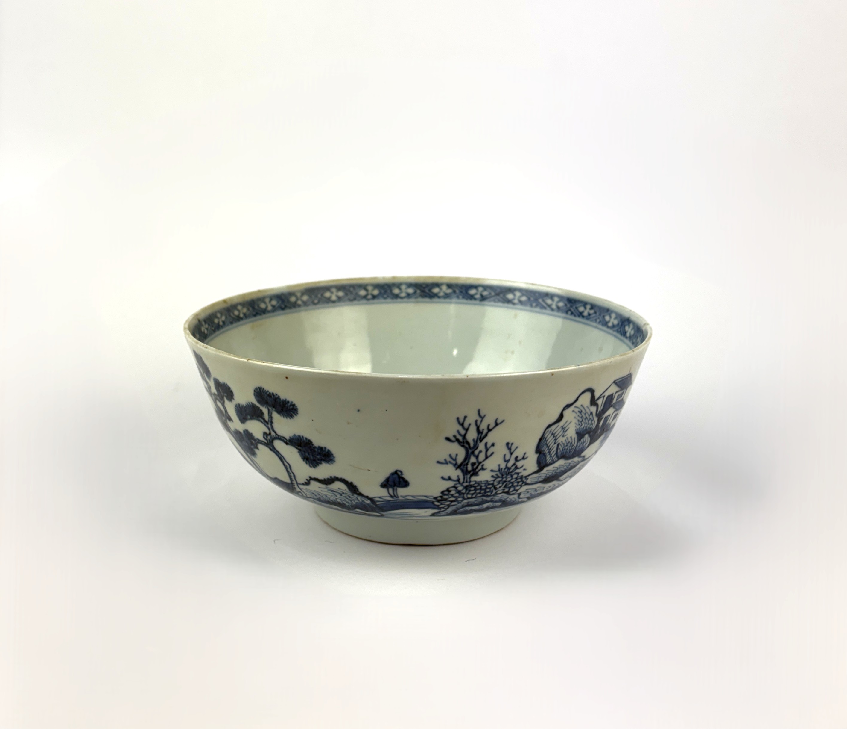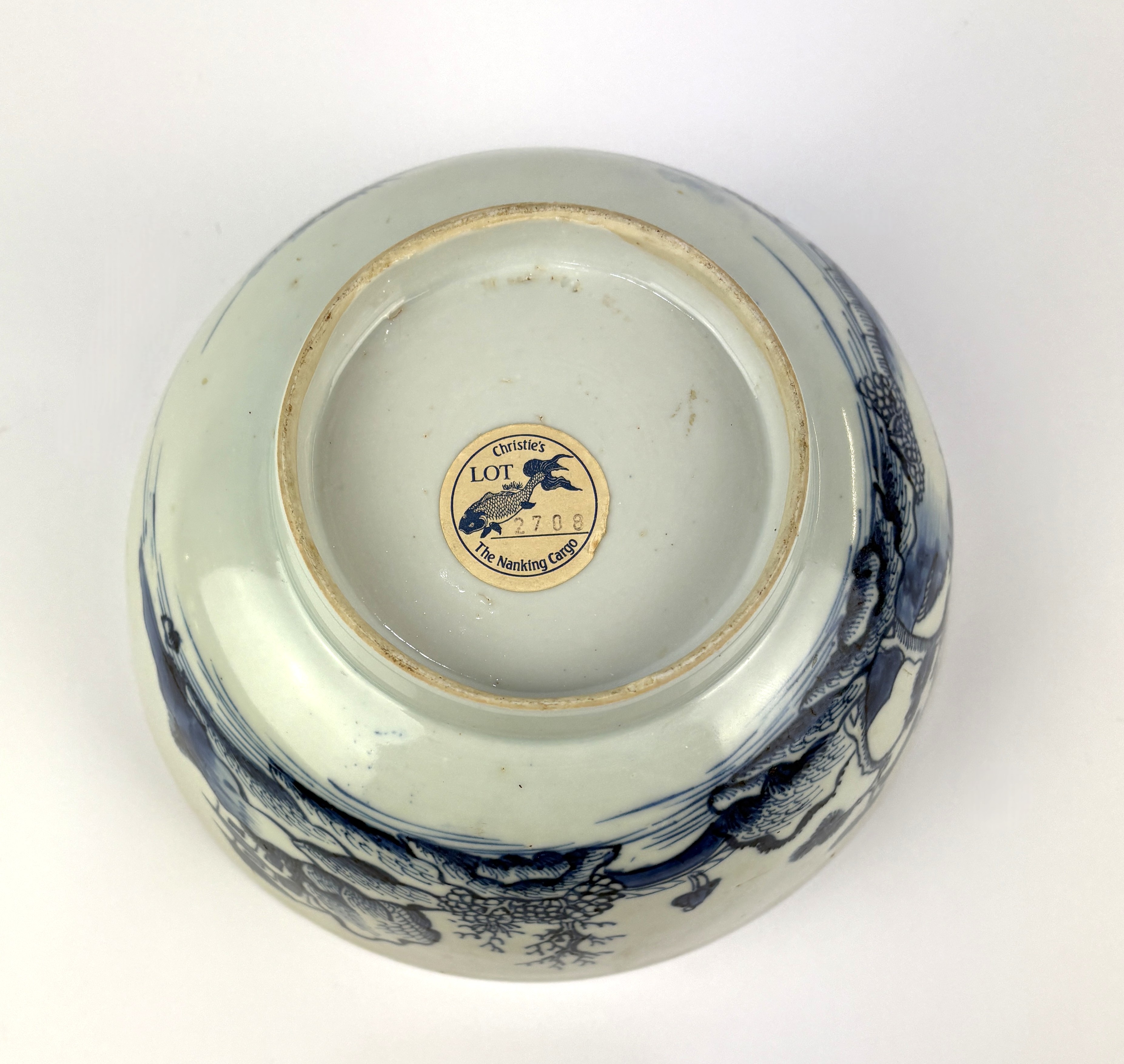 An 18th century Chinese blue and white porcelain 'Nanking' cargo bowl, decorated with landscape scenes, bearing Christies label to base 'Lot 2708', diameter 19.5.cm