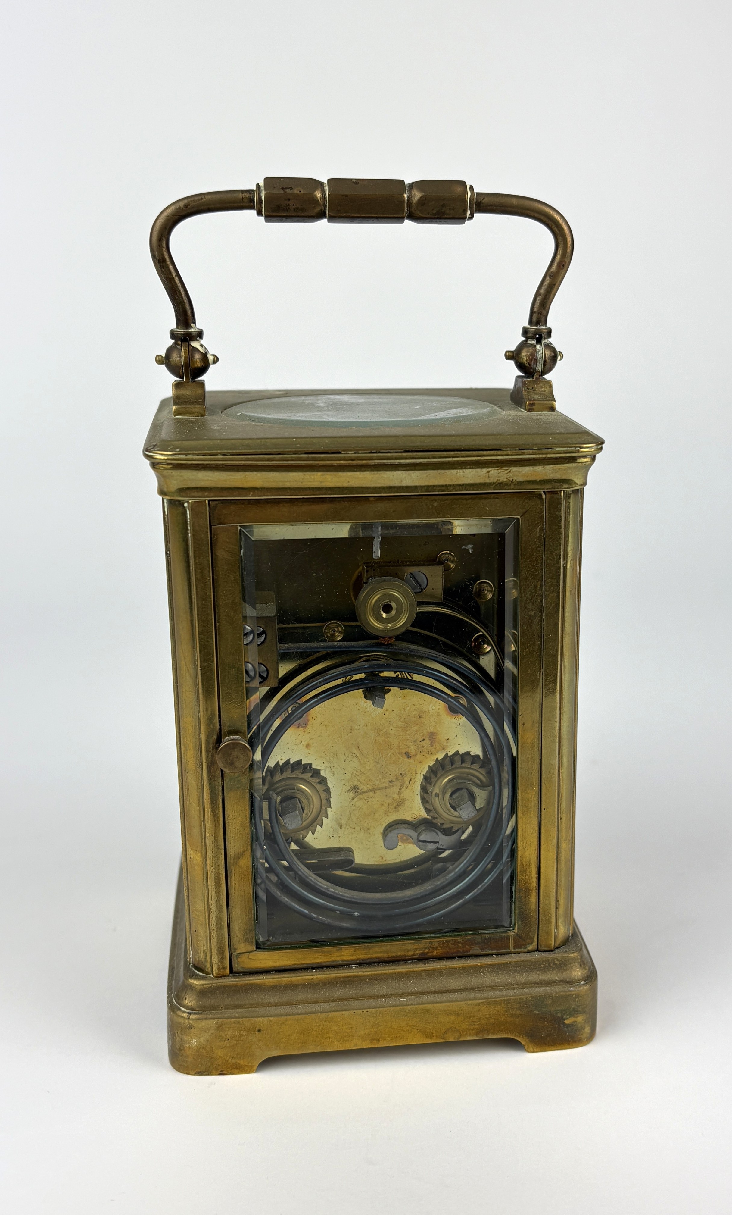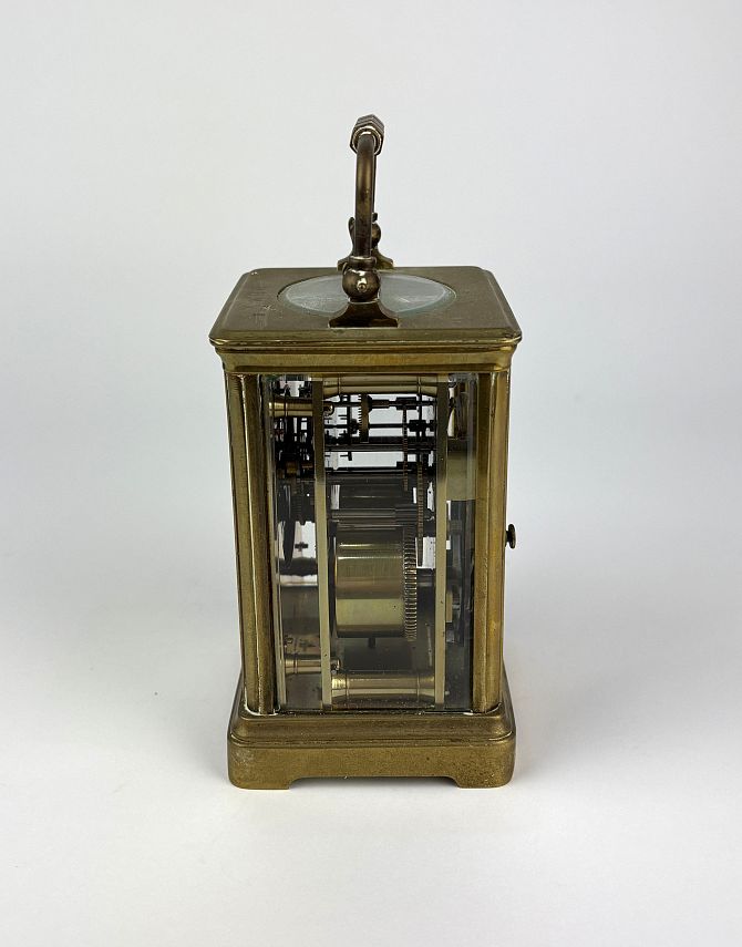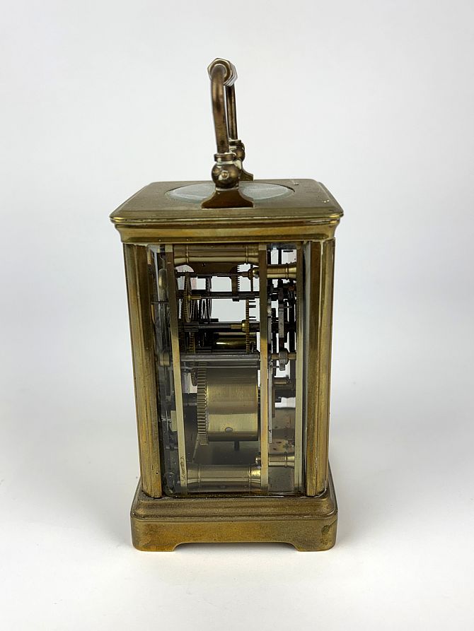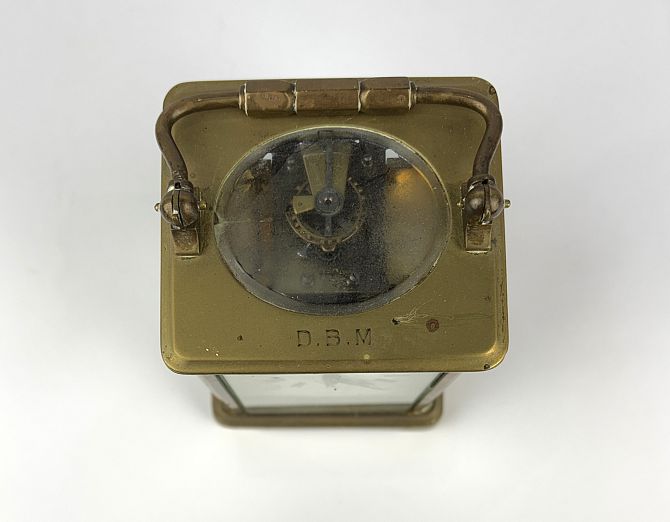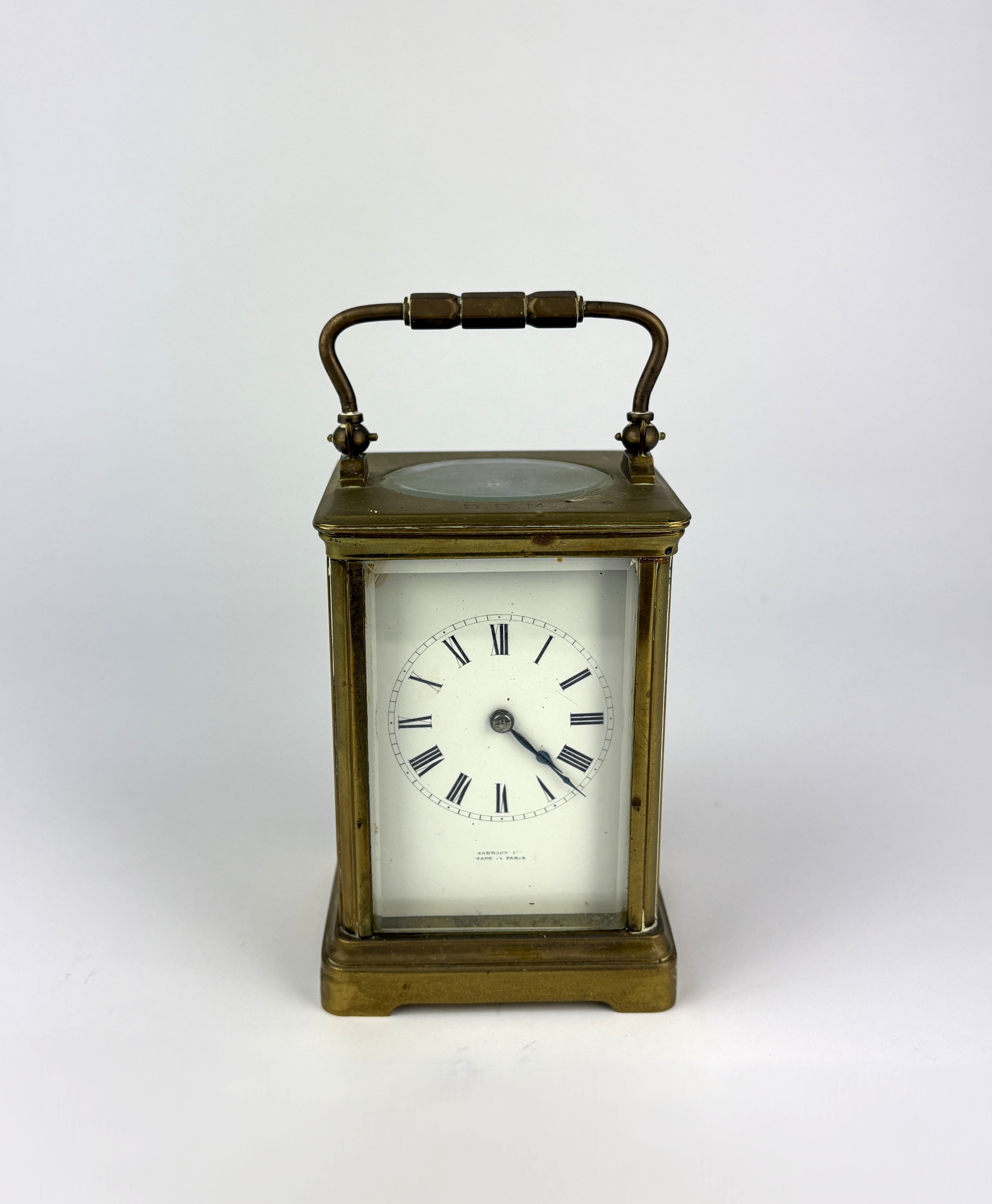 A French brass carriage clock, the white enamelled dial with Roman numerals, inscribed 'Harrods Ltd., Made in Paris', with blue steel hands, bearing engraved initials 'D.B.M. to top, height 14cm