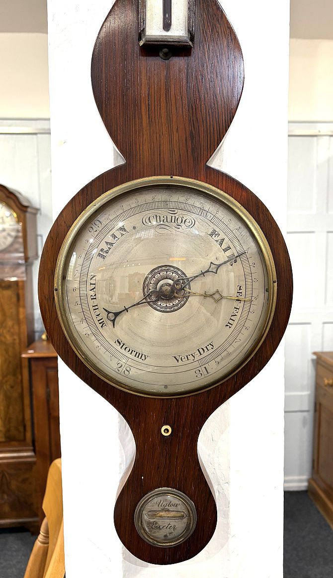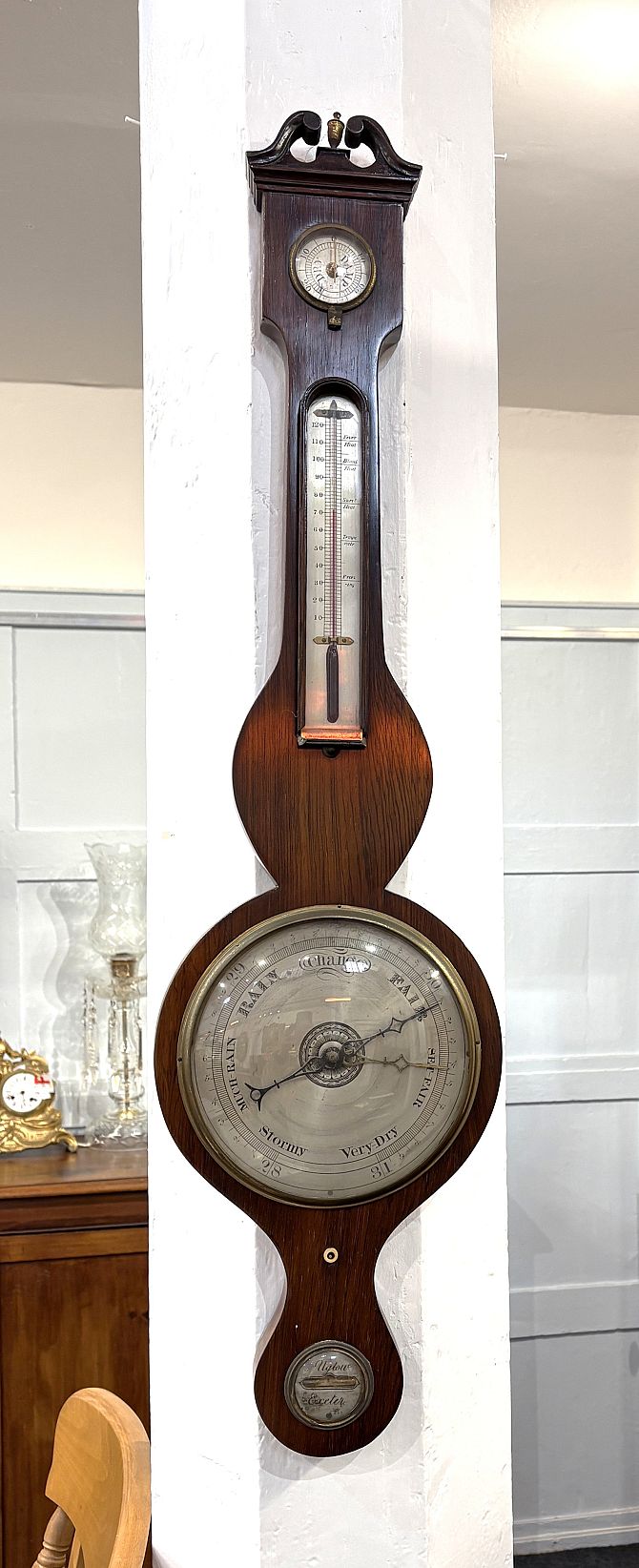 A 19th century rosewood cased wheel barometer with four silvered dials for the barometer, thermometer, hydrometer, and spirit level, 95cm high.