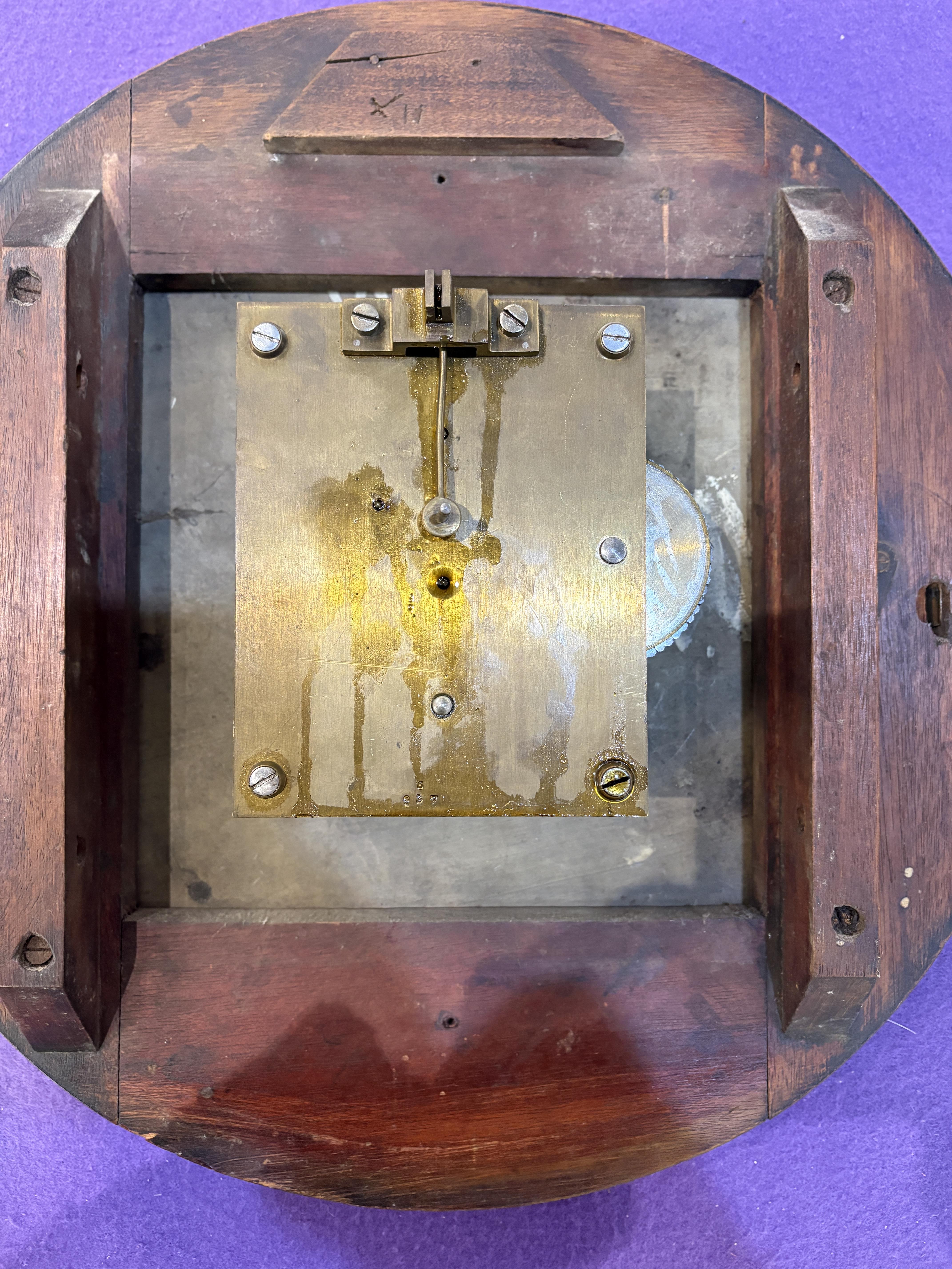 A 30 hour travel clock, possibly Austrian, in wooden drum shaped case surmounted...