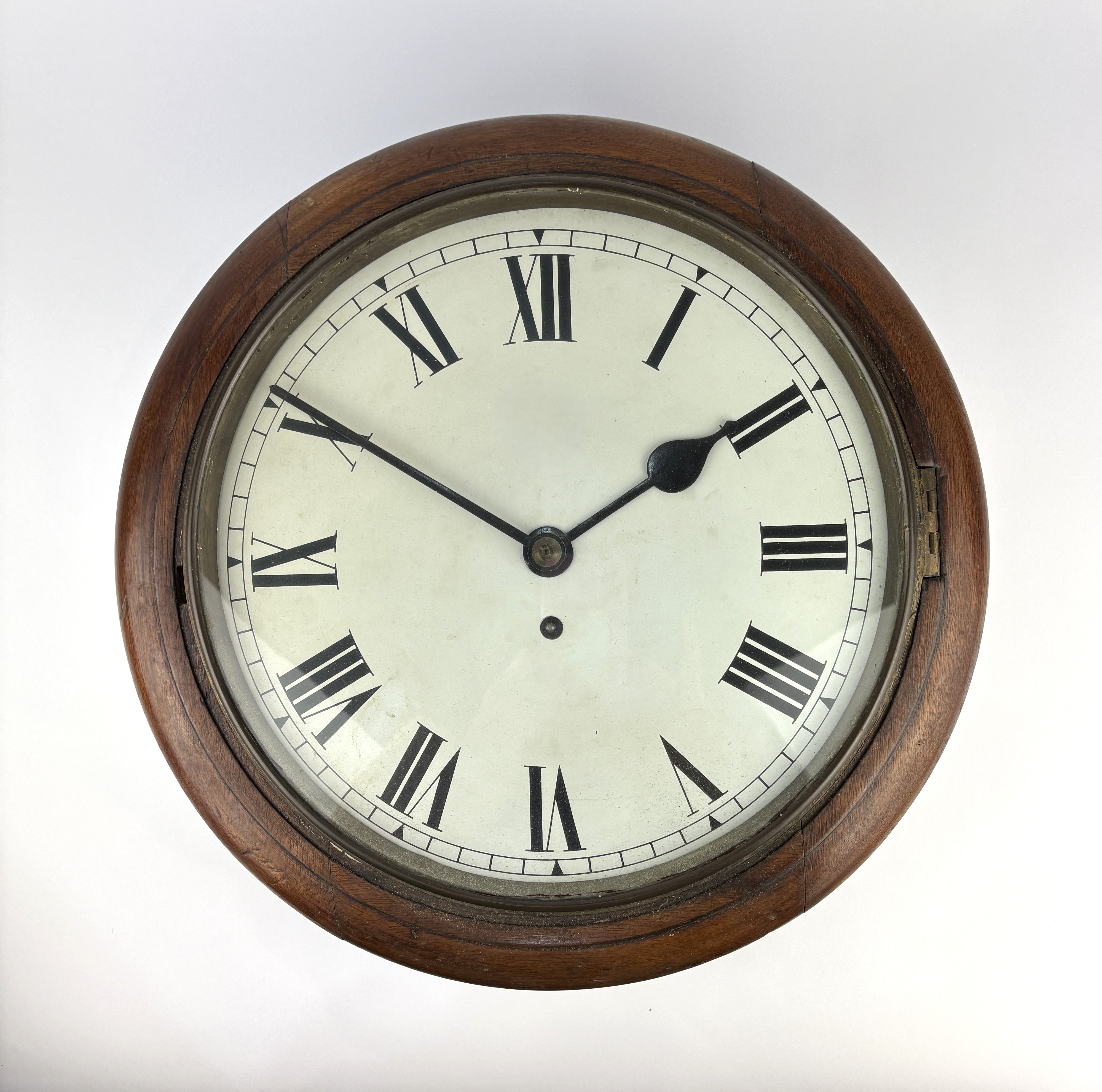 A 19th century mahogany cased circular fusee wall clock, the white enamelled dial with Roman numerals, 40cm diameter, with pendulum and key