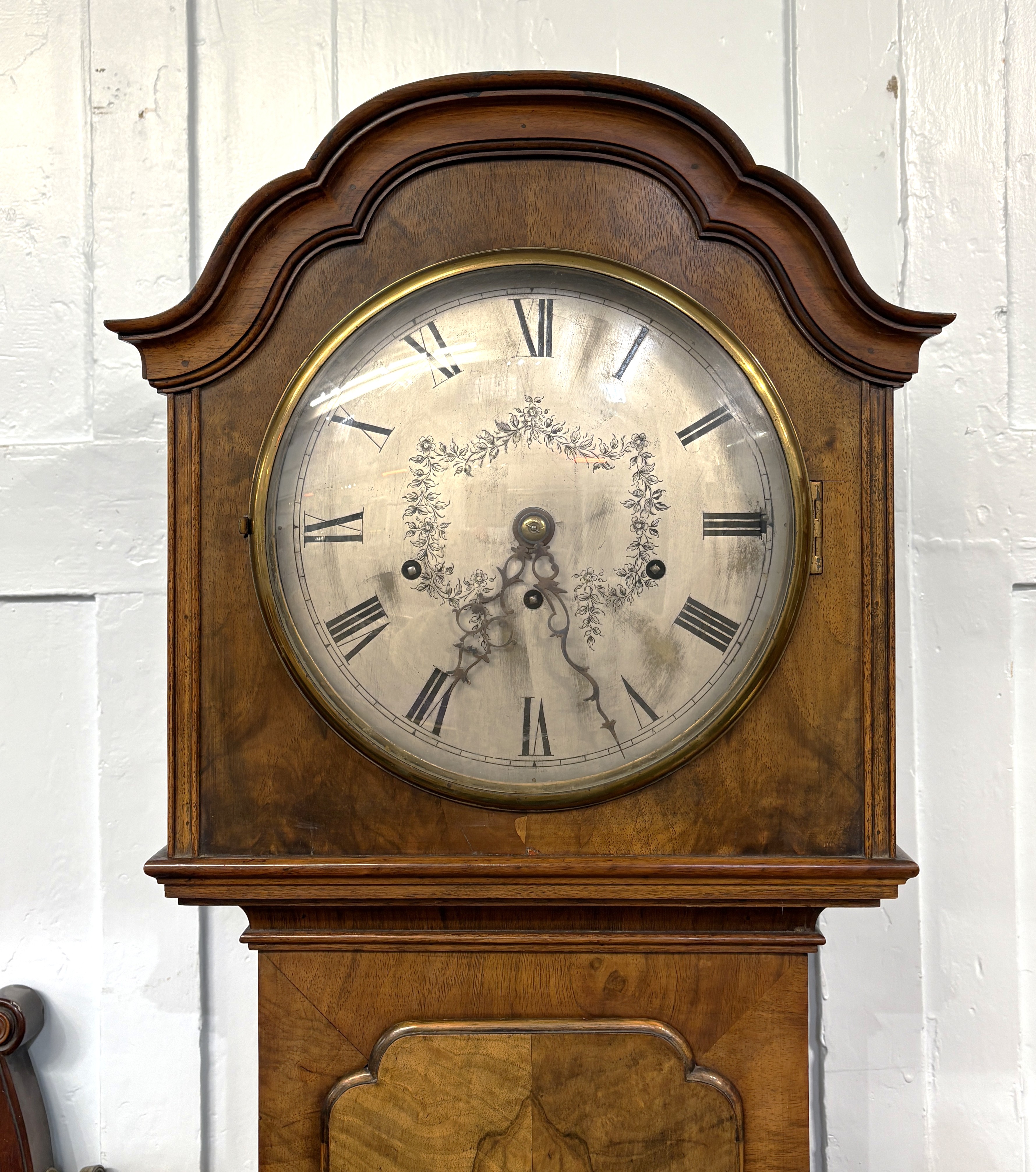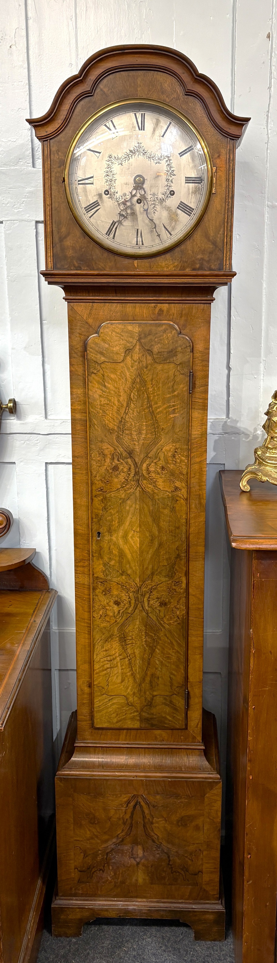 An early 20th century walnut chiming Grandmother clock the circular silvered dial with Roman numerals and attractive floral design, in bracket feet, presentation plaque to interior dated 1936, 188.5cm high, with pendulum, three brass weights and winding key