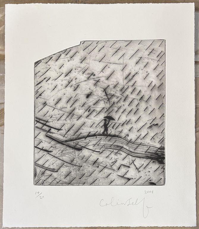 Colin Self (British, b.1941), 'Man in a Rainstorm', 2008, limited edition etching numbered 14/20, signed and dated, 18cm by 16cm, unframed.