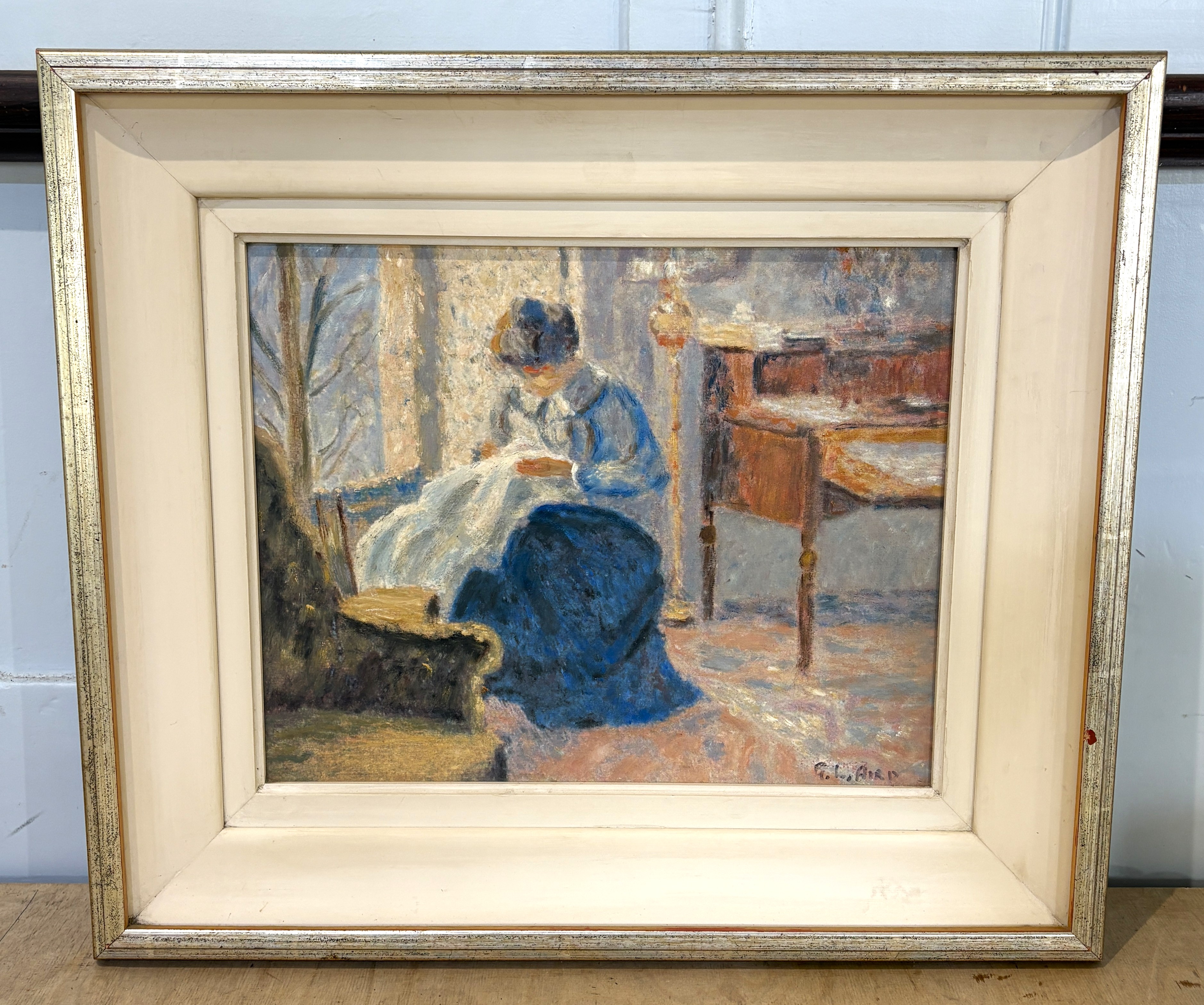 George Aird (British, 1934 - 2021), 'Interior scene with a lady sewing, in the French Post Impressionist style', oil on board, signed, label verso for Grove Fine Art of Manchester, 27cm by 34cm, framed.