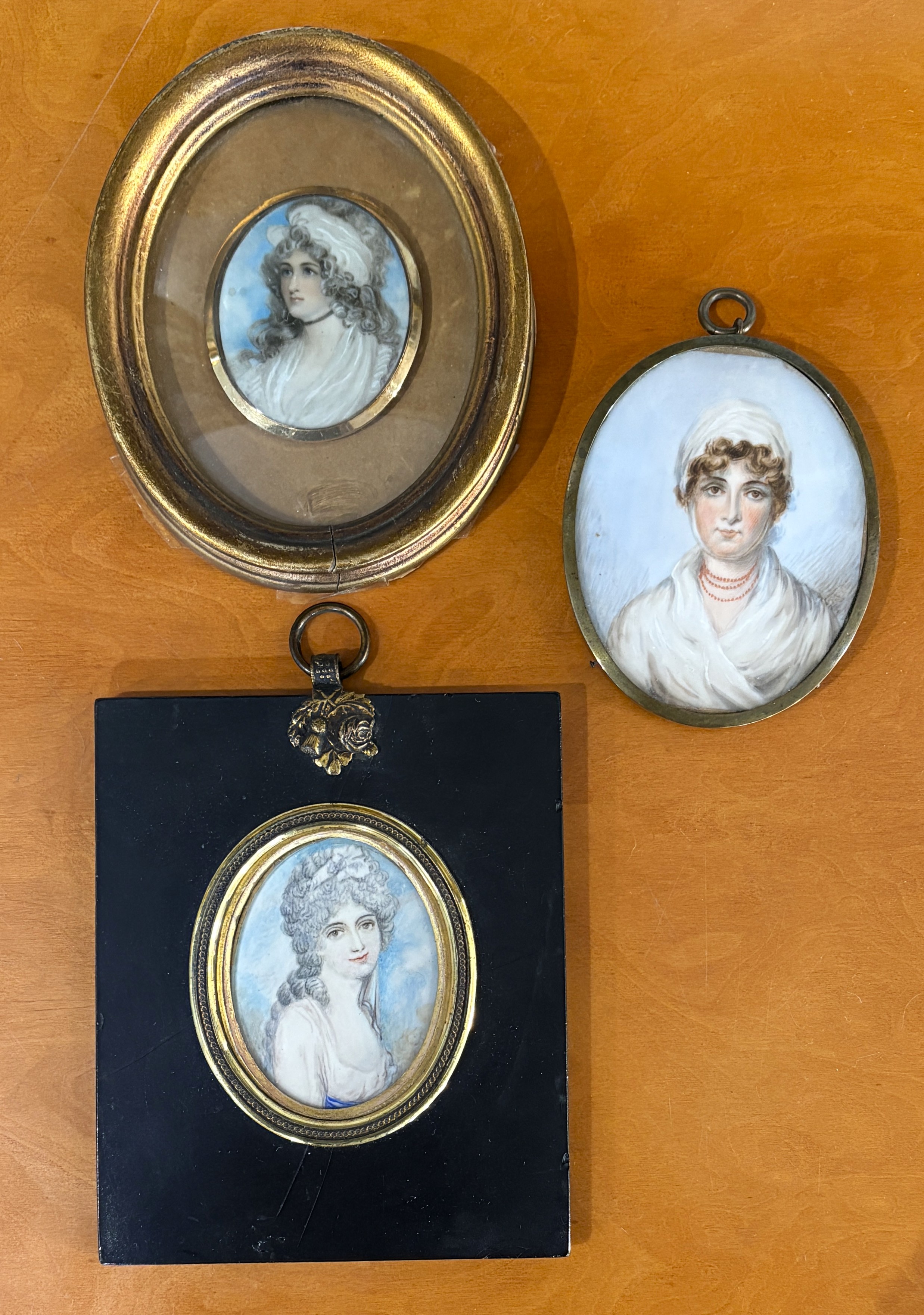 Portrait Miniatures: three hand painted oval studies of young women, all framed, (3).