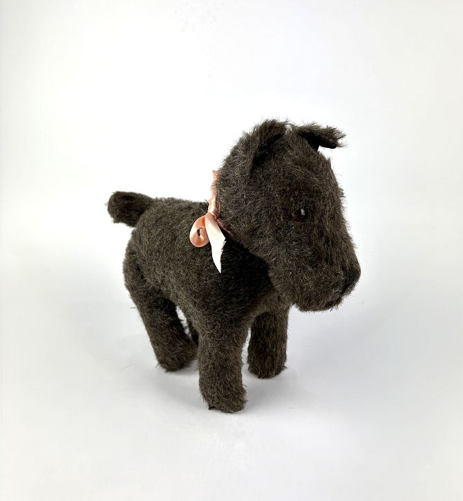 A vintage toy Scottish Terrier dog, c. 1950s, straw filled with black / grey plush and amber eyes, height 27.5cm