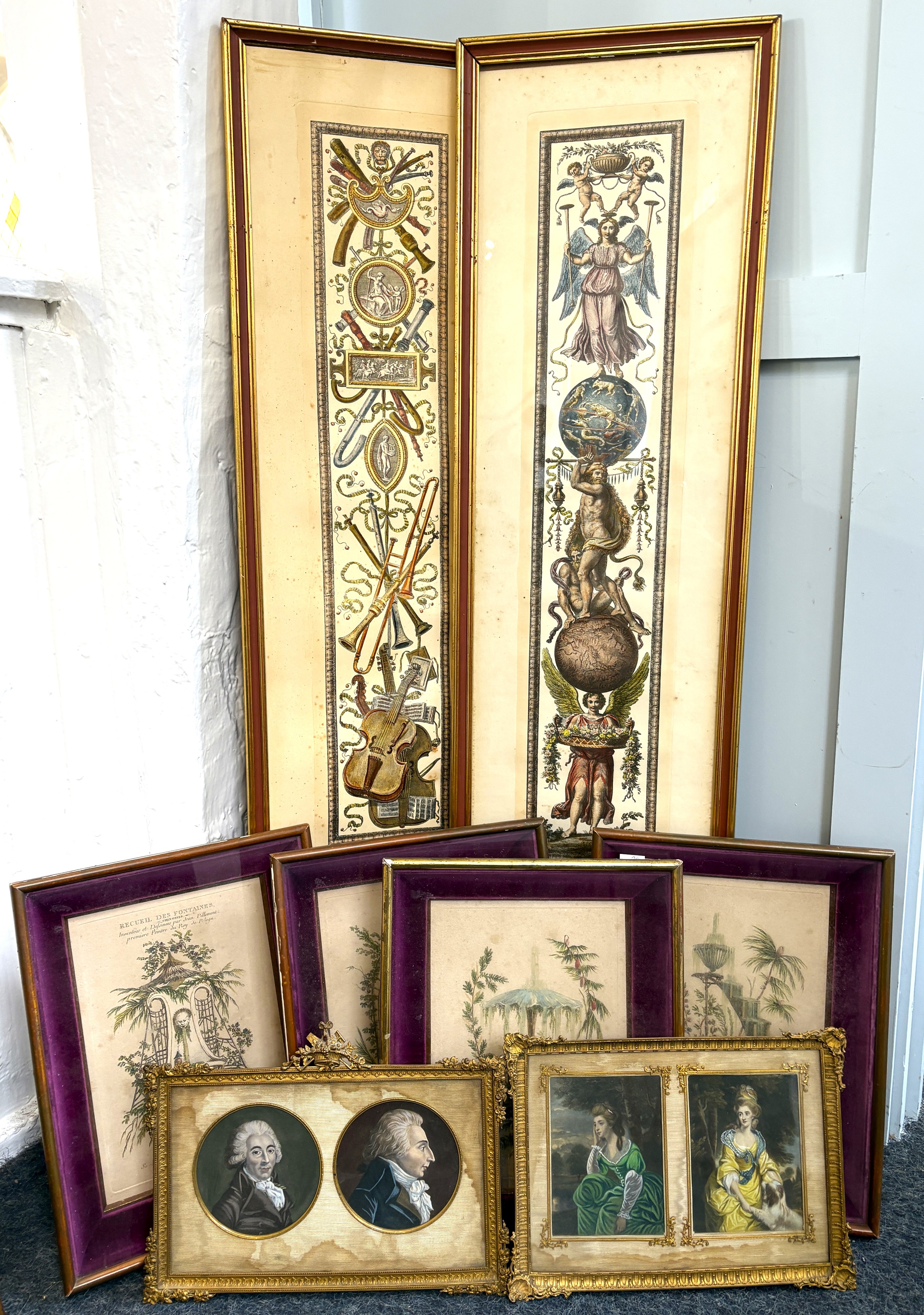 Mixed Art: comprising two pairs of overpainted mezzotint portraits in the 18th century style, inset ornate gilt metal double frames (frames 30cm wide), a set of four coloured engravings 'Chinese Fountains' after Jean Pillement, inset matching box frames (frames 35cm by 27cm), and a pair of coloured engravings 'Raphael's Loggias in the Vatican', insetgilt frames (frames 106cm by 29cm), (8), (af).
