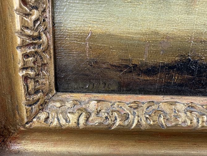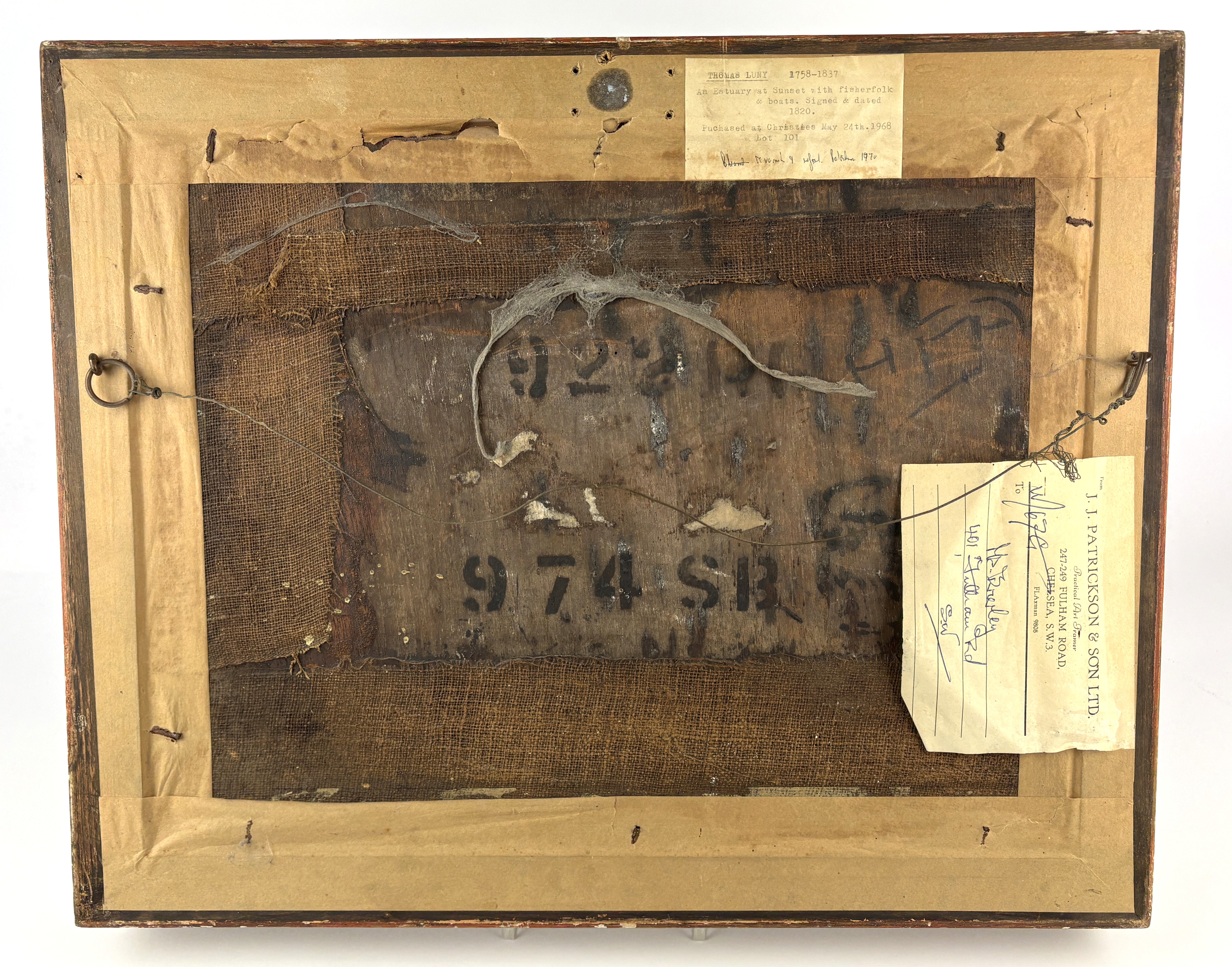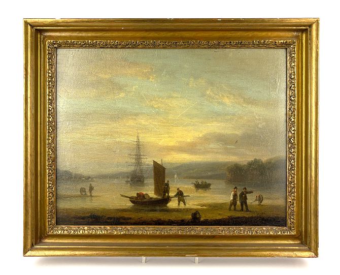 Manner of Thomas Luny (British, 1759-1837), An Estuary at Sunset with Fisherfolk and Boats, oil on panel, signed and dated lower 'T. Luny, 1820', bearing typed label verso 'Purchased at Christies, May 24th 1968, Lot 101', and 'J.J. Patrickson & Son Ltd., 247-9 Fulham Road, Chelsea' inscribed slip, framed, 29.2cm x 39cm