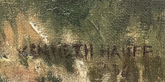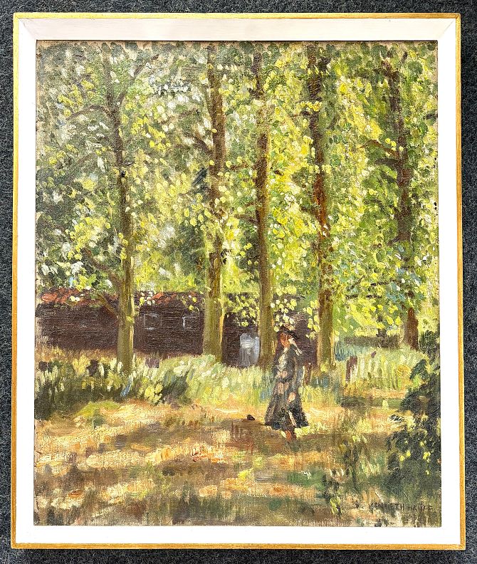 Kenneth Hauff (British, 1913 - 1967), The Woodland Walk, impressionist style female figure in a woodland landscape, oil on canvas, signed lower right, within frame, 59.5cm x 50cm (ARR)
