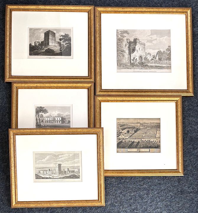 Three framed engravings of Portchester Castle, Hampshire, to include an example after F Nicholson engraved by J Noble for the Beauties of England and Wales, 11.5cm by 16cm, together with two framed engravings of Southwick, Southampton (5)