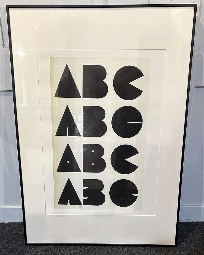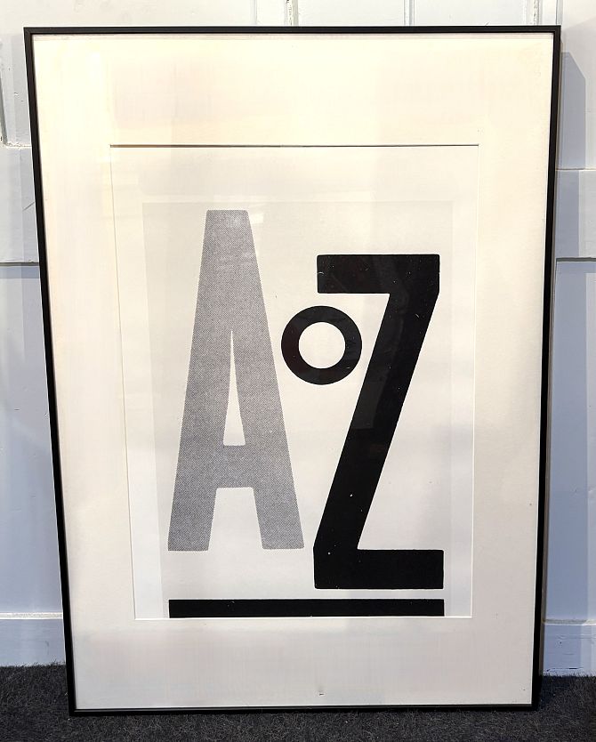 Two contemporary prints: 'AZ' by Hemingway Design and 'ABC' by Snug Studio, each 70cm by 50cm, matching frames, (2).