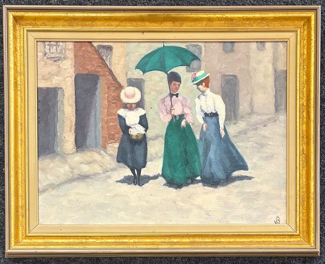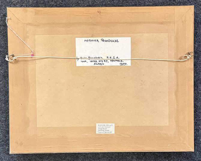 British School (20th century), The Morning Promenade', by John Bradford, 1977, oil on board, the impressionist French inspired painting depitching three Edwardian style ladies, bearing monongram lower right and labelled verso, framed, 28.5cm x 38.75cm