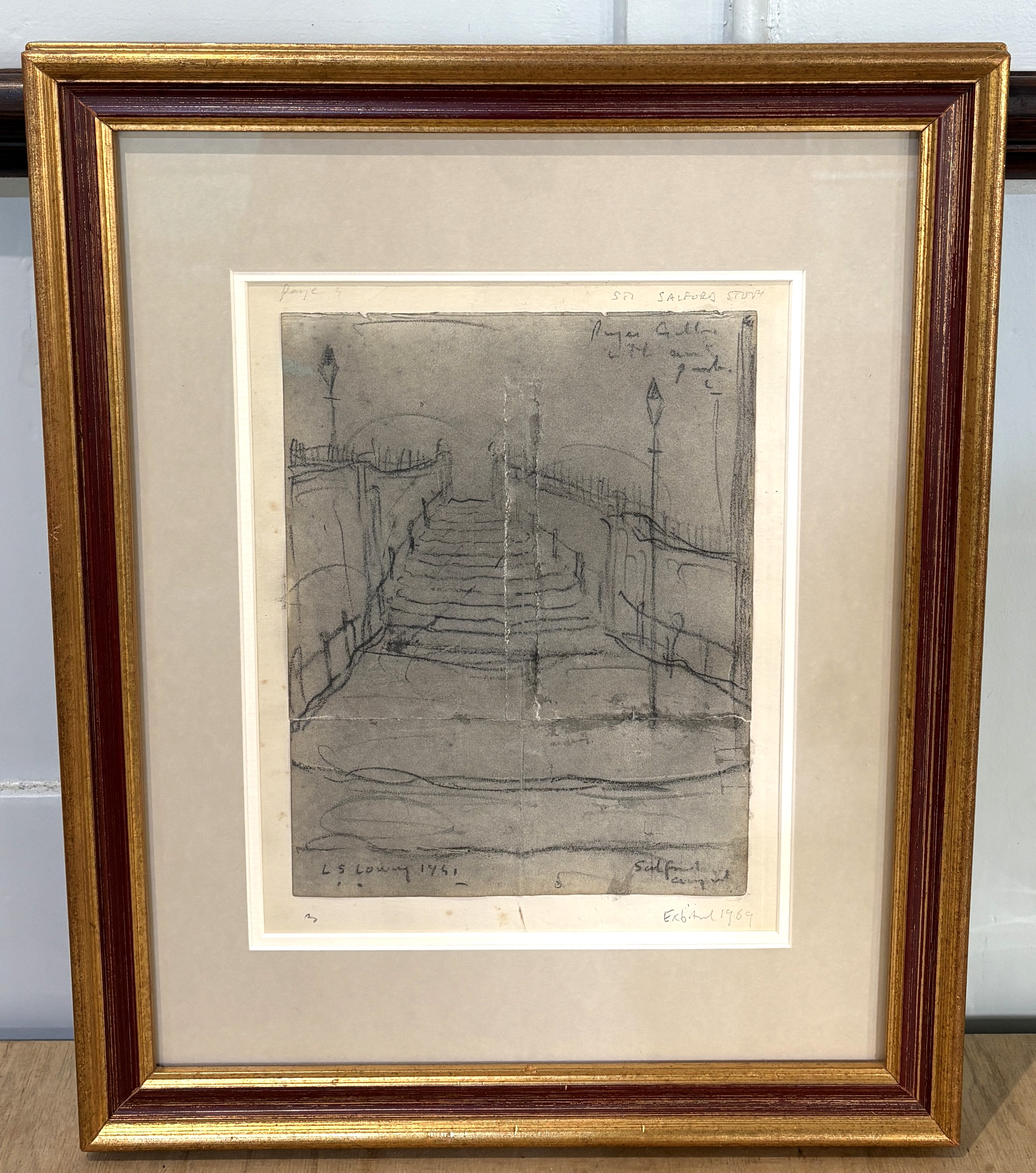 Laurence Stephen Lowry RBA RA (British, 1887 - 1976), 'Salford Steps', pencil drawing, likely a preparatory sketch, signed and dated 1941, variously inscribed front and verso, 24cm by 18cm, inset double sided modern frame, (af).