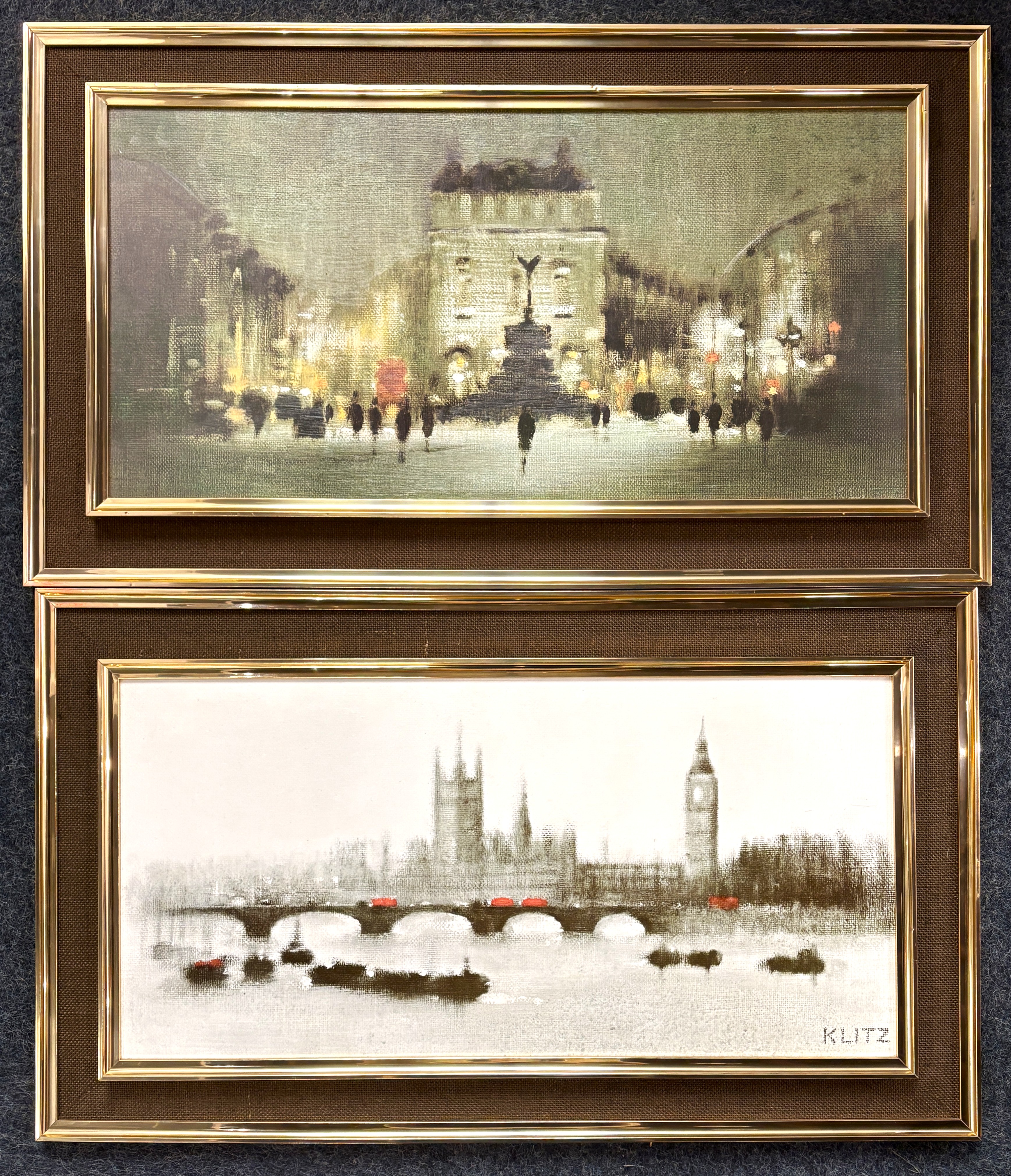 Mid Century Continental School, two prints, The Houses of Parliament from the River Thames, together with a Eros and Piccadilly Circus, each bearing name 'Klitz' to lower right, framed amd mounted, the first 36.5cm by 75cm (2)