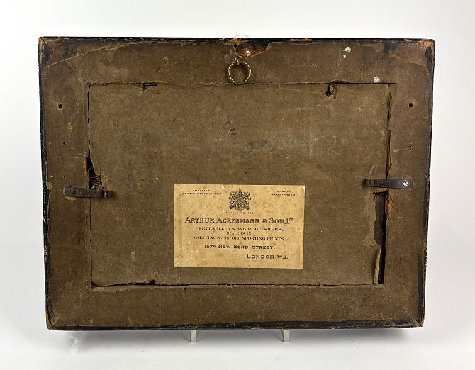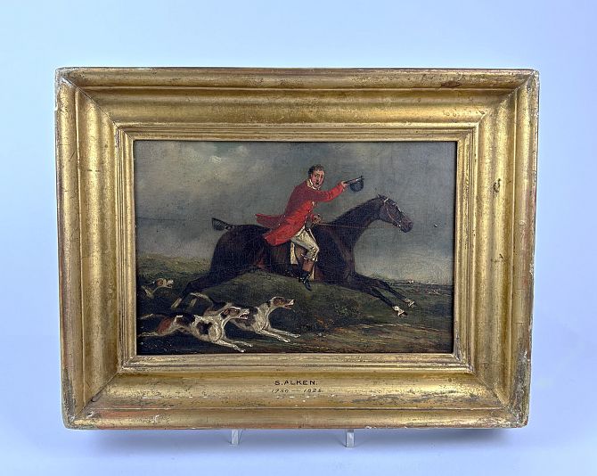 Attributed to Samuel Alken (British, 1784 - c.1825), 'Huntsman and Hounds', oil on wooden panel, old label verso for Arthur Ackerman & Sons Ltd, 157A New Bond Street, London, frame inscribed "S Alken 1750-1825", 17cm by 25cm, giltwood frame.