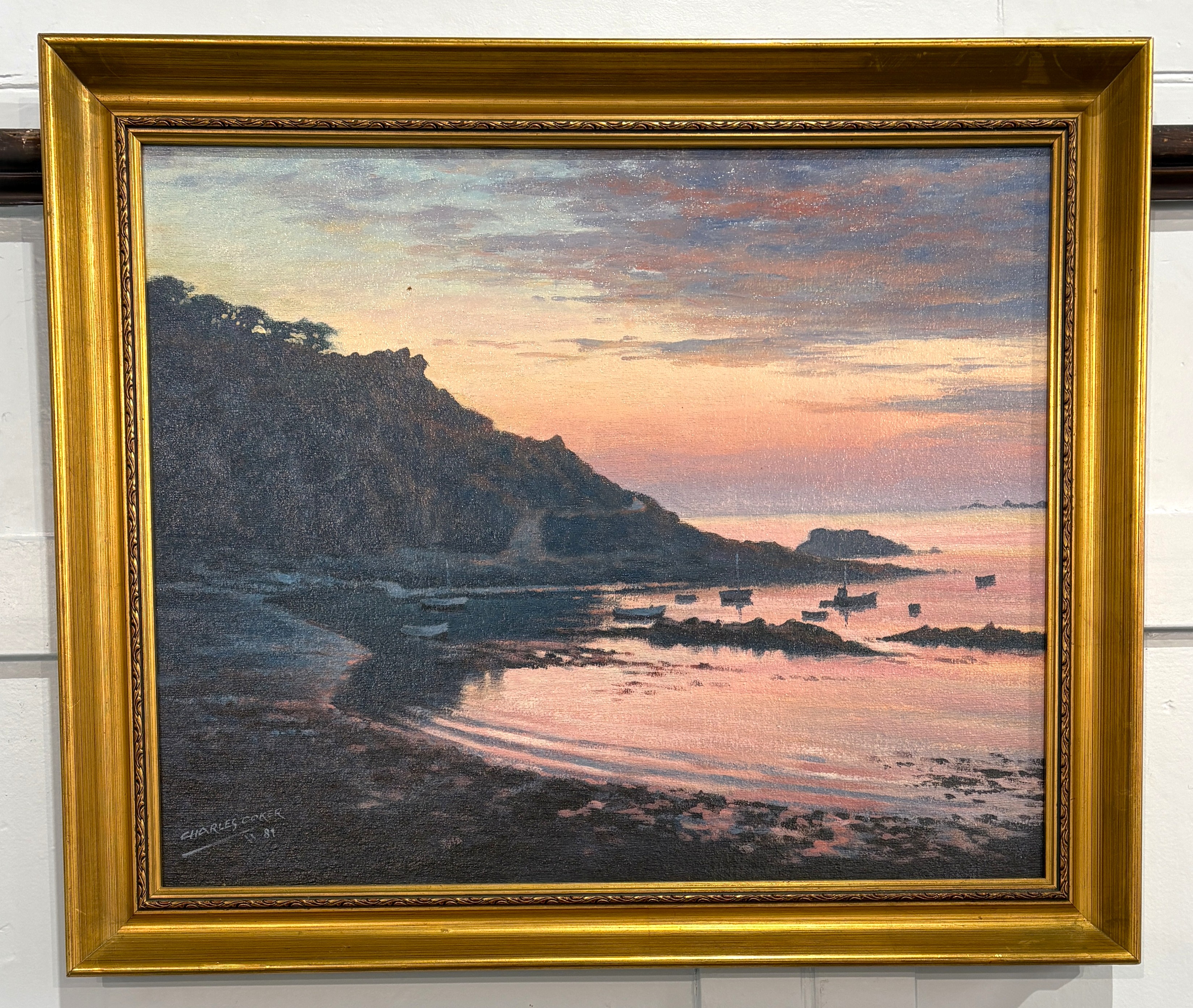Charles Coker (1918-2000), coastal landscape view, Guernsey, 'Sunset at Portelet', oil on board, signed and dated 81, verso inscribed paper label, 44cm by 54cm