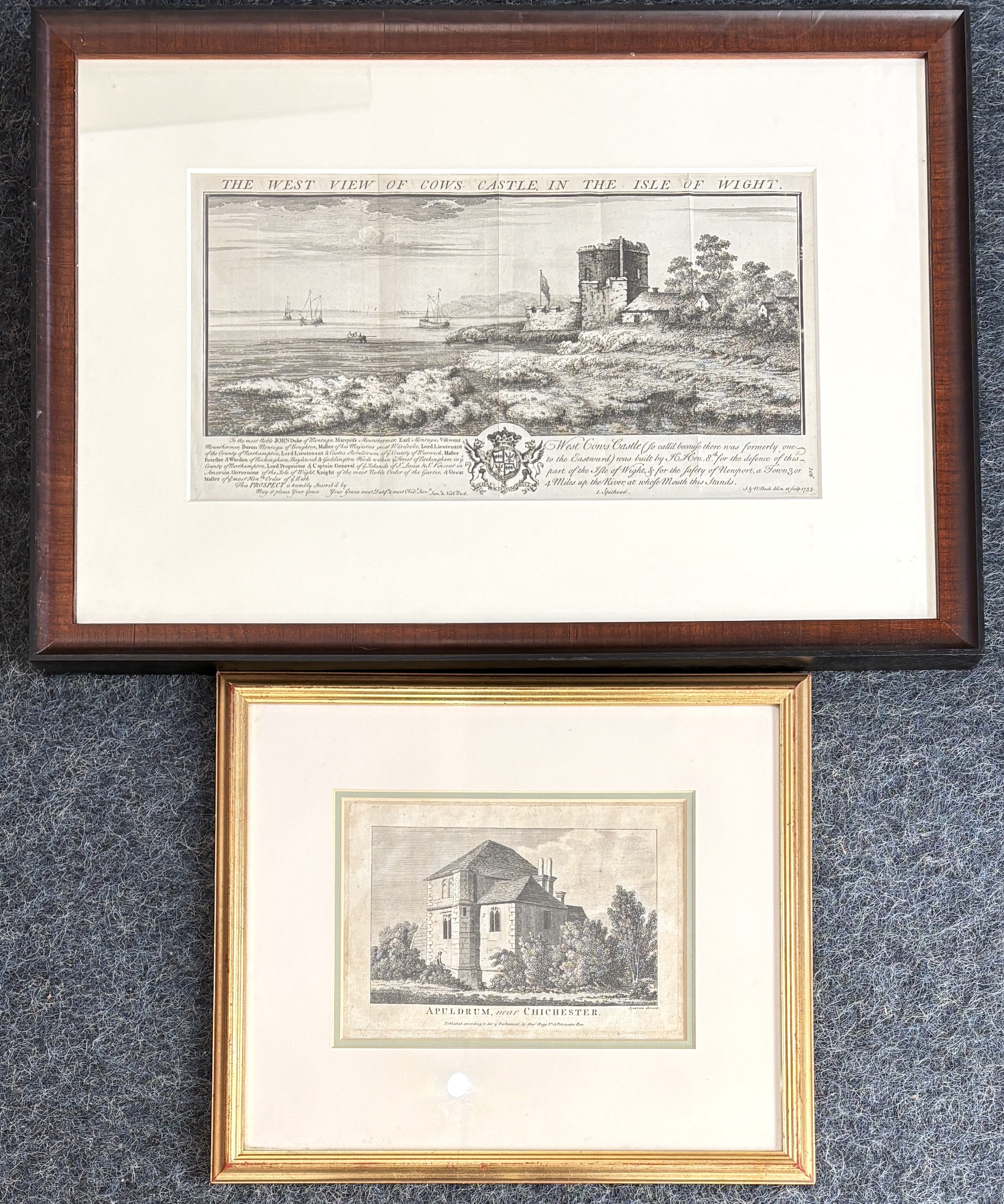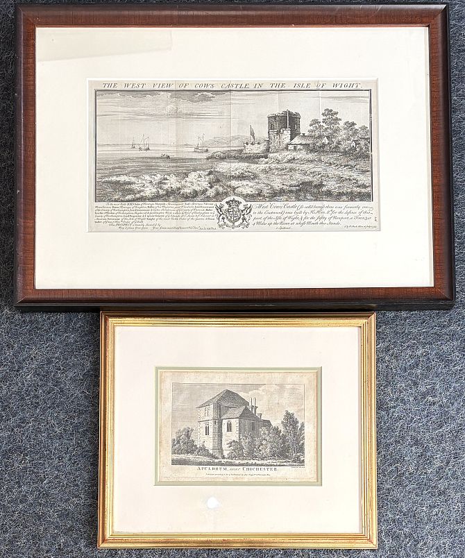 After Samuel and Nathaniel Buck, 'The West View of Cows Castle, In The Isle of Wight', engraving, 19cm by 36cm, together with S Sparrow, 'Apuldrum, near Chichester', engraving, 13.5cm by 19.5cm (2)