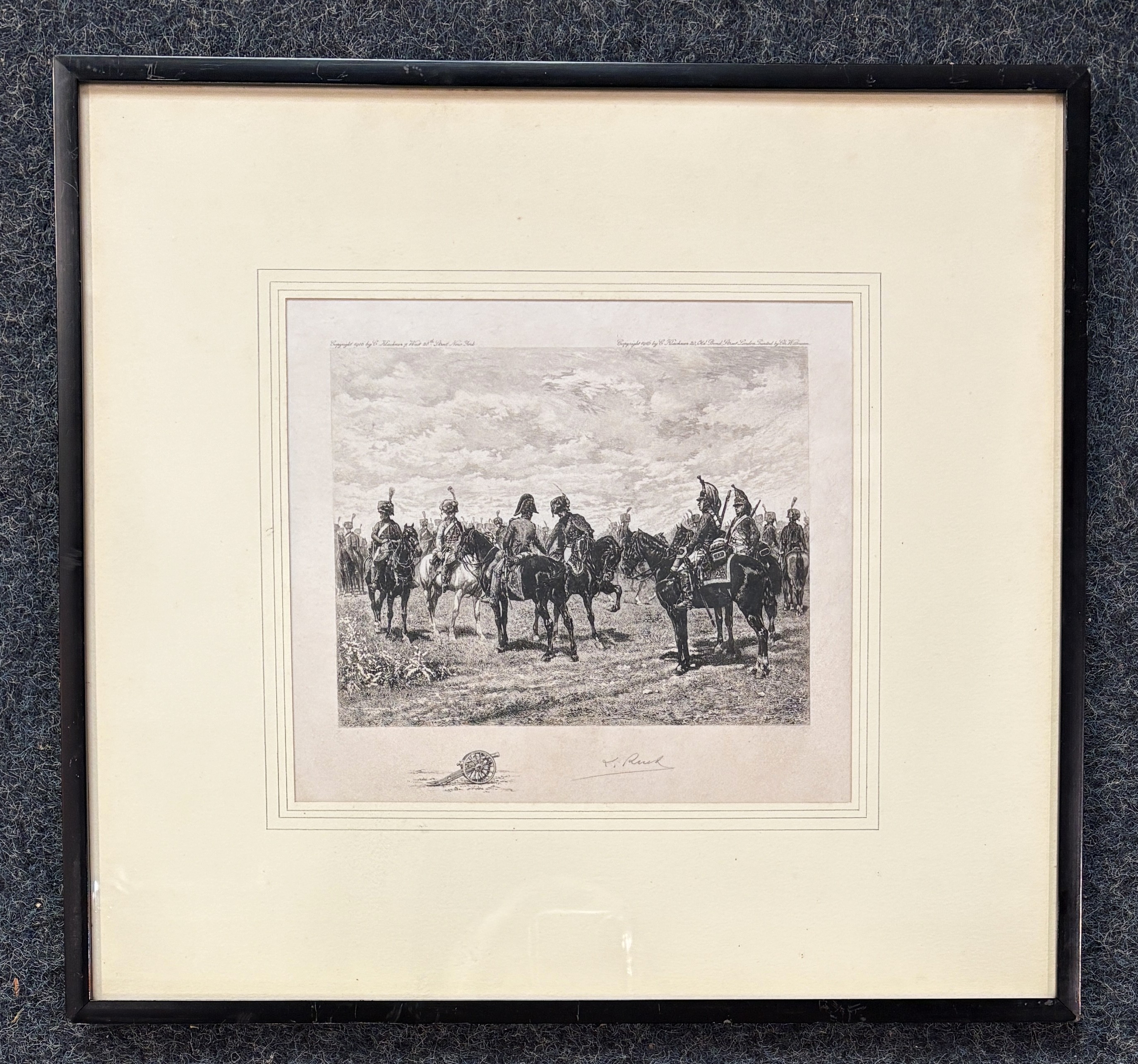 Louis Ruet after Ernest Messonier (French, 1815 - 1891), Napoleonic Hussars and Dragoons, etching, published by C. Klackner, 20 Old Bond St., London', dated 1916, signed by Louis Ruet to margin, framed and mounted, 19.75cm by 23.25cm