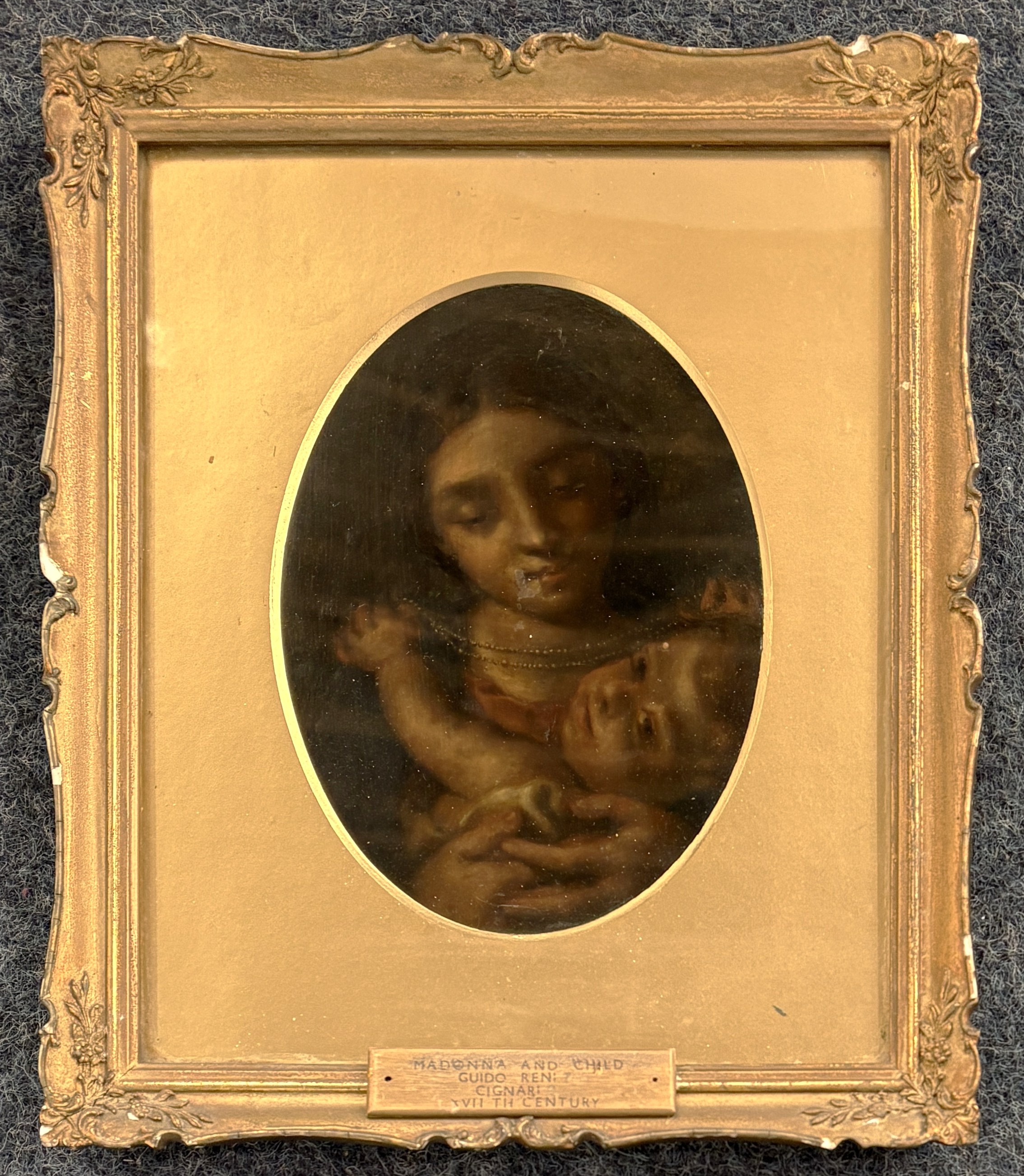 Follower of Guido Reni (Italy, 1575 - 1642), 'Madonna and Child', small oval oil painting, name plaque mounted to frame, 20cm by 15cm, inset 19th century gilt frame and slip, (frame af).