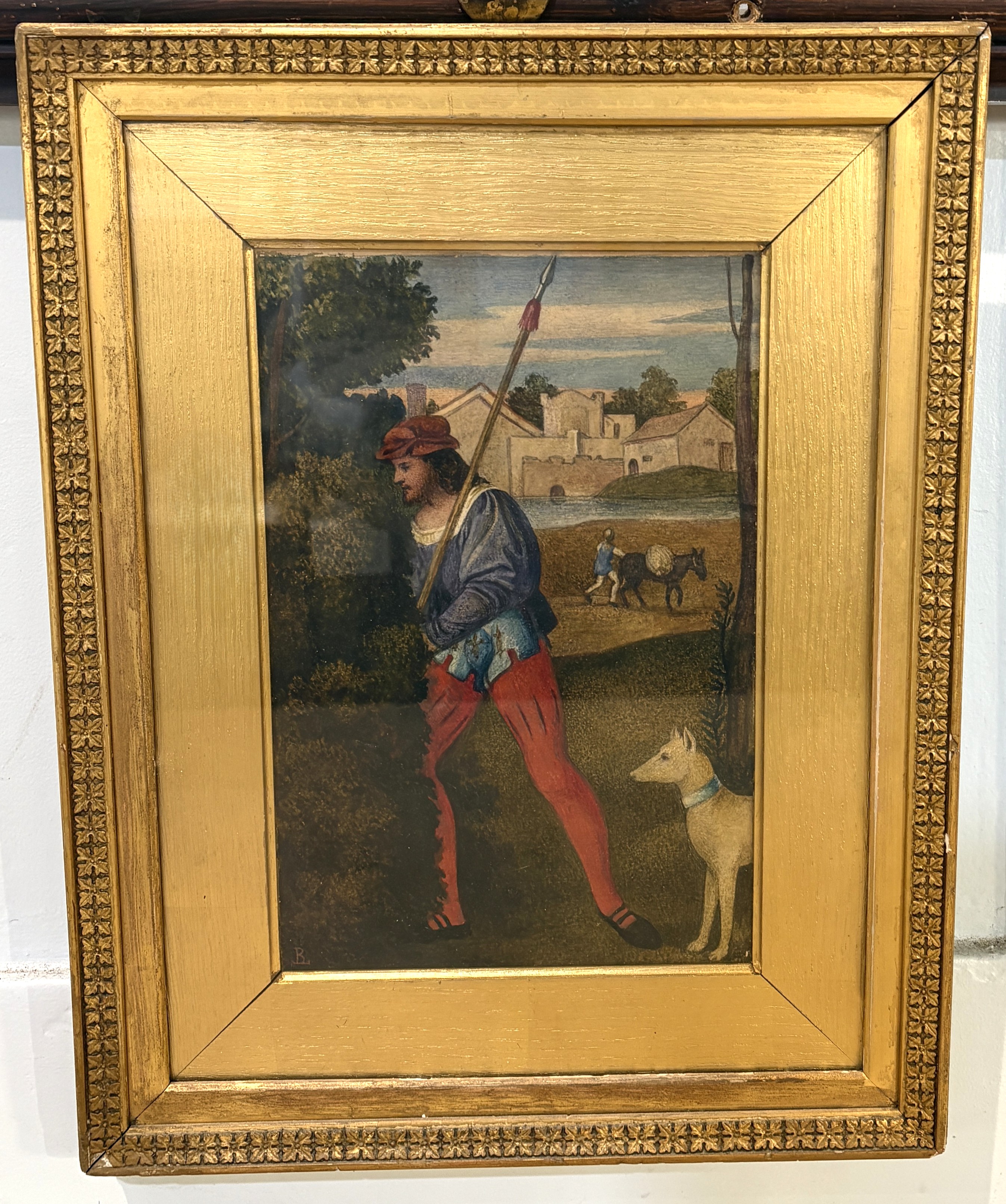Pre-Raphaelite School - Medieval style watercolour depicting a male figure and hound within a landscape, with buildings, figure and mule in the background, monogramed lower left, 22cm by 15cm, framed.